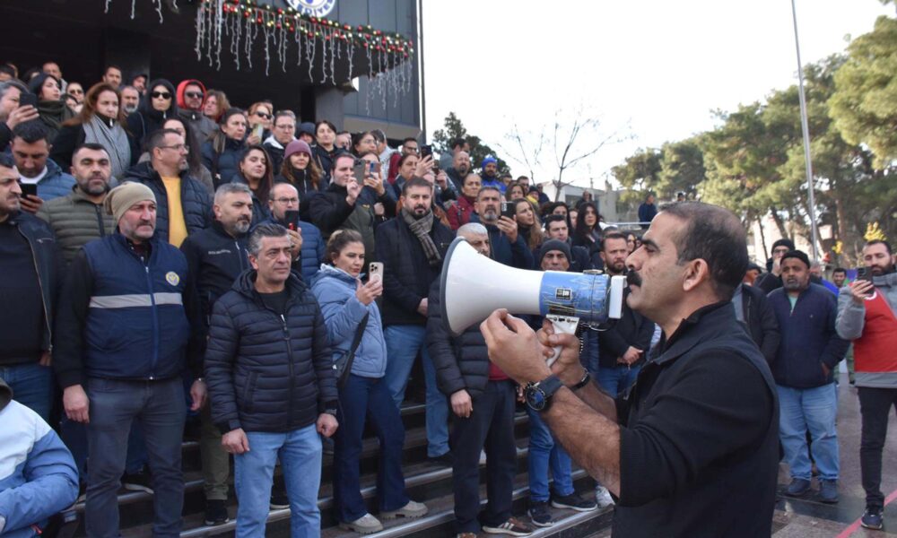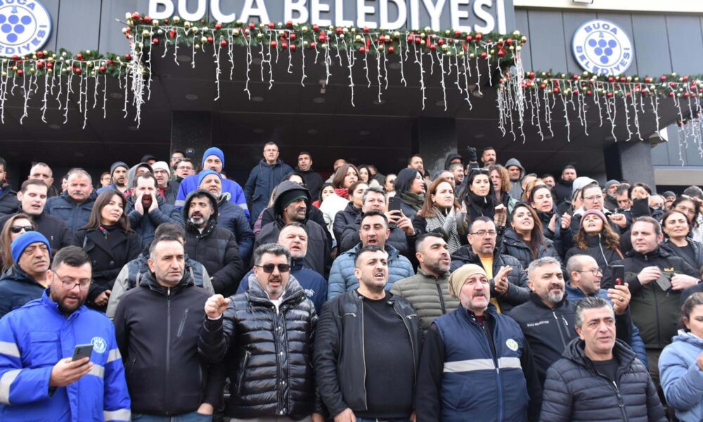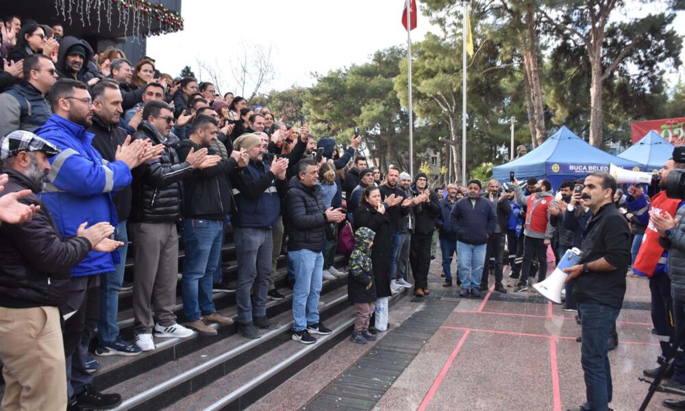 “Bugün anaokulları çalışmıyor, onlarla ilgili karar vereceğiz ama saat 00.00dan itibaren bu şehirde çöpü toplamayacağız. Şu an bütün birimlerimiz eylemde, yemekhanemizi işçilere yemek çıkardıkları için çalıştırıyoruz. Kanunen zorunlu hizmet olan veteriner ve sağlık hizmetlerinde çalışmamız devam ediyor. Ama onun dışındaki bütün iş yerlerimizde yarın iş bırakma eylemini topyekun gerçekleştiriyoruz. Yaklaşık 1600 kişi iş bırakacak. Yeni yıla 1 gün kaldı. İşçinin parası yok, yılbaşıyla ilgili herhangi bir hazırlık yapamadı. Evine erzak, çocuklarına giyecek, oyuncak, hediye alamadı. Koca bir kent yılbaşı gecesi evinde oturup, eğlenip, ailesiyle otururken maalesef Buca Belediyesi emekçileri o gece de sokakta eylem yapmaktan başka bir şey yapmayacak. Eğer eyleme devam edersek de yeni yılın ilk gününde o gece bütün Bucalıları bu meydanda yanımıza destek vermeye çağırıyoruz.”