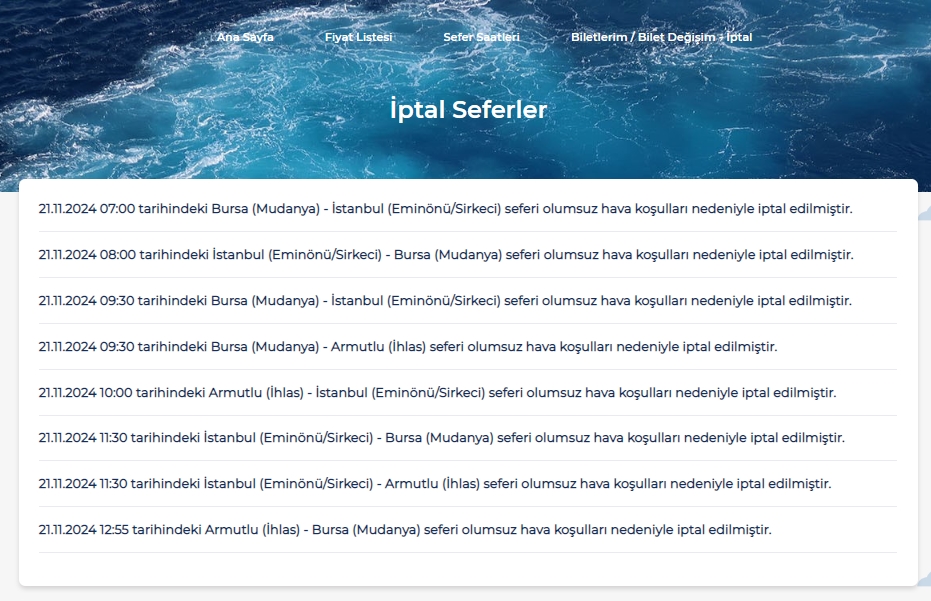 BUDOdan yapılan duyuruda, 07.00 ile 12.55 saatleri arasında yapılması planlanan Bursa (Mudanya) – İstanbul (Eminönü/Sirkeci), İstanbul (Eminönü/Sirkeci) – Bursa (Mudanya), Bursa (Mudanya) – İstanbul (Eminönü/Sirkeci), Bursa (Mudanya) – Armutlu (İhlas), Armutlu (İhlas) – İstanbul (Eminönü/Sirkeci),İstanbul (Eminönü/Sirkeci) – Bursa (Mudanya), İstanbul (Eminönü/Sirkeci) – Armutlu (İhlas), Armutlu (İhlas) – Bursa (Mudanya) olmak üzere karşılıklı 8 deniz otobüsü seferinin iptal edildiği belirtildi.
