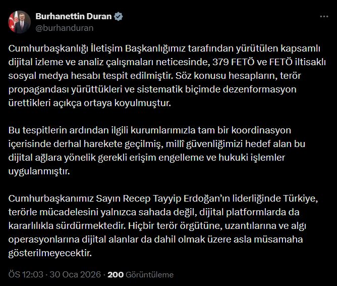 İletişim Başkanı Burhanettin Duran, sanal medya hesabından yaptığı paylaşımda, “Cumhurbaşkanlığı İletişim Başkanlığımız tarafından yürütülen kapsamlı dijital izleme ve analiz çalışmaları neticesinde, 379 FETÖ ve FETÖ iltisaklı sosyal medya hesabı tespit edilmiştir. Söz konusu hesapların, terör propagandası yürüttükleri ve sistematik biçimde dezenformasyon ürettikleri açıkça ortaya koyulmuştur. Bu tespitlerin ardından ilgili kurumlarımızla tam bir koordinasyon içerisinde derhal harekete geçilmiş, milli güvenliğimizi hedef alan bu dijital ağlara yönelik gerekli erişim engelleme ve hukuki işlemler uygulanmıştır. Cumhurbaşkanımız Sayın Recep Tayyip Erdoğan’ın liderliğinde Türkiye, terörle mücadelesini yalnızca sahada değil, dijital platformlarda da kararlılıkla sürdürmektedir. Hiçbir terör örgütüne, uzantılarına ve algı operasyonlarına dijital alanlar da dahil olmak üzere asla müsamaha gösterilmeyecektir” ifadelerini kullandı.