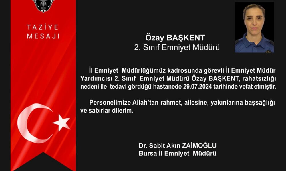 Bursada, İl Emniyet Müdürlüğü Sosyal Hizmetlerden Sorumlu İl Emniyet Müdürü Yardımcısı Özay Başkent, uzun süre kolon kanseri tedavisi gördü. Rahatsızlığı ilerleyince hastaneye kaldırılan 2 çocuk annesi Özay Başkent, doktorların tüm müdahalesine rağmen bugün yaşamını yitirdi. Meslektaşının ölümünden sonra, Bursa İl Emniyet Müdürü Sabit Akın Zaimoğlu, yayınladığı taziye mesajında, “İl Emniyet Müdürlüğümüz kadrosunda görevli İl Emniyet Müdür Yardımcısı 2nci Sınıf Emniyet Müdürü Özay Başkent, rahatsızlığı nedeni ile tedavi gördüğü hastanede 29.07.2024 tarihinde vefat etmiştir. Personelimize Allahtan rahmet, ailesine, yakınlarına başsağlığı ve sabırlar dilerim” ifadelerine yer verdi.