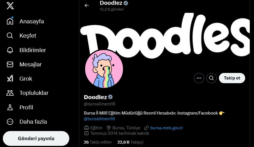 Öte yandan Bursa İl Milli Eğitim Müdürlüğünün hesabını hackleyenler ise sayfanın kullanıcı fotoğrafını değiştirip ‘Doodles’ yazısı yazdı.