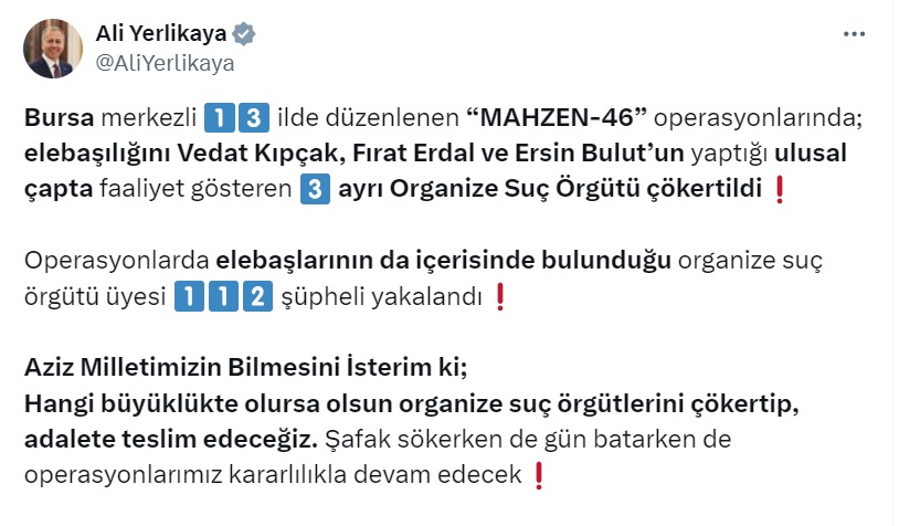 • İçişleri Bakanı Ali Yerlikaya, Bursa merkezli 13 ilde düzenlenen 'Mahzen-46' operasyonlarında elebaşılığını Vedat Kıpçak, Fırat Erdal ve Ersin Bulut'un yaptığı ulusal çapta faaliyet gösteren 3 ayrı organize suç örgütü çökertildiğini, 112 kişinin gözaltına