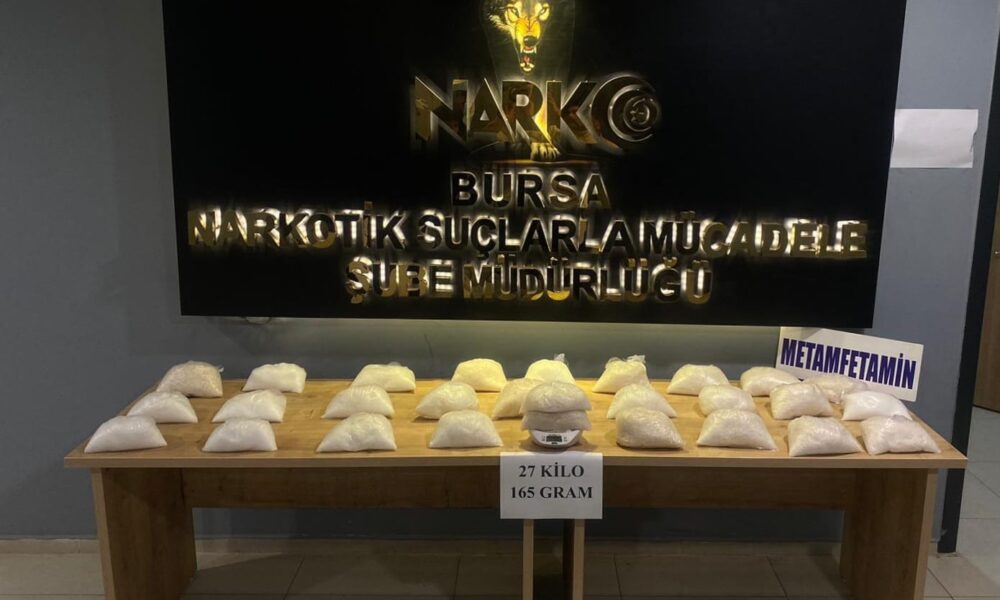 Bursa Emniyet Müdürlüğü Narkotik Suçlarla Mücadele Müdürlüğü ekipleri, 4 şüphelinin kentte uyuşturucu ticareti yapacağı istihbaratıyla çalışma başlattı. Teknik ve fiziki takibin ardından S.D., A.O., T.O. ve M.K.G. isimli şüphelilerin, İstanbul’da oldukları belirlendi. İstanbul Emniyet Müdürlüğü Narkotik Suçlarla Mücadele Şube Müdürlüğü ekiplerinin desteği ile şüphelilerin evlerine eş zamanlı operasyon düzenlendi. Operasyonda, 2si yabancı uyruklu, 4 şüpheli gözaltına alındı. Adreslerdeki aramalarda, 27 kilo 165 gram metamfetamin ile 1 hassas terazi ele geçilirdi.