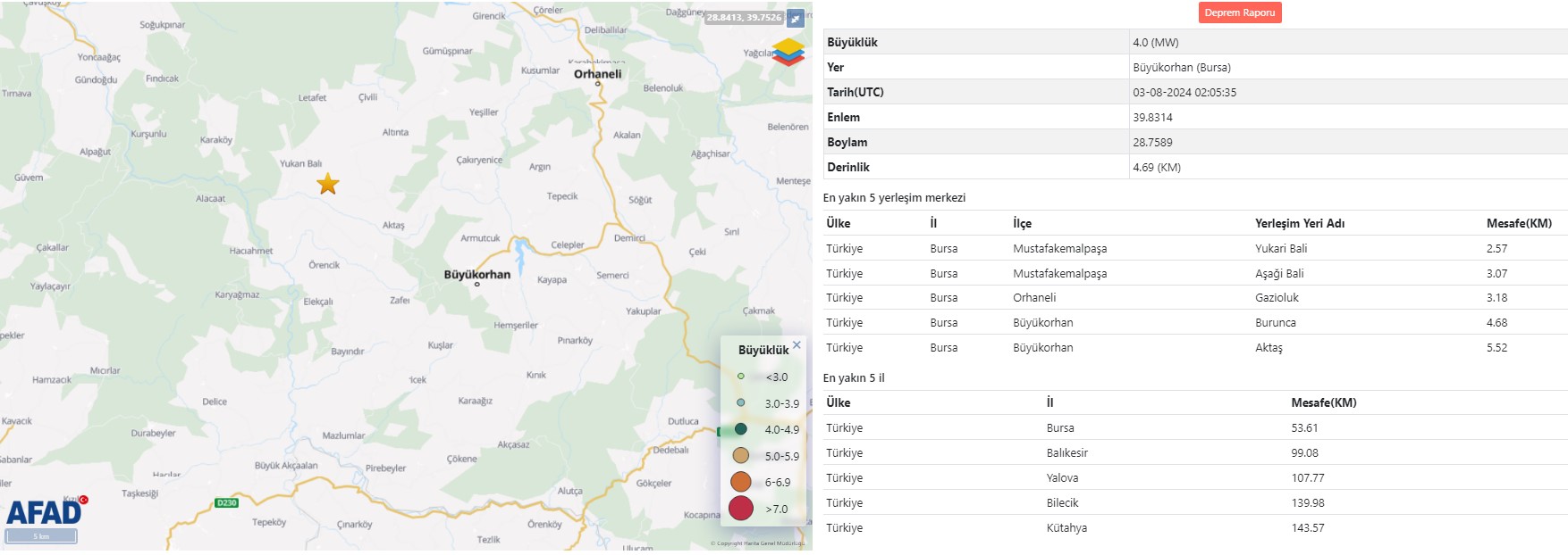 Afet ve Acil Durum Yönetimi Başkanlığı (AFAD) verilerine göre, saat 05.05de merkez üssü Bursanın Büyükorhan ilçesi olan Riçhter ölçeğine göre 4.0 büyüklüğünde deprem kaydedildi. Zeminden 4.69 kilometre derinlikte meydana gelen deprem, Orhaneli ve çevre ilçelerinden de hissedildi. AFAD ve belediye ekipleri depremden sonra tarama çalışmaları başlatırken, ilk belirlemelere göre herhangi bir olumsuzluk yaşanmadı.