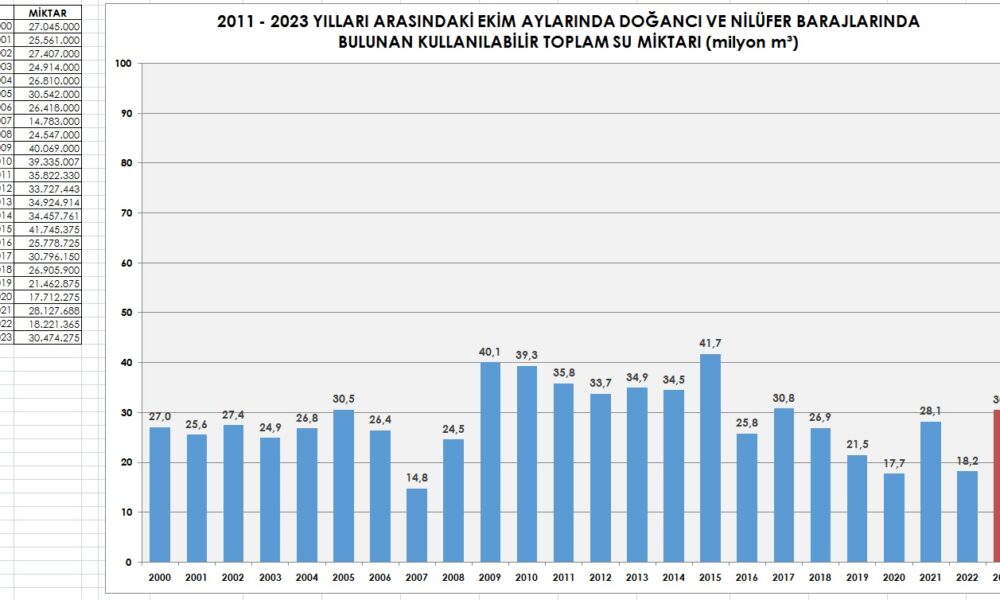 Bursa'nın içme suyu ihtiyacını karşılayan, Nilüfer ve Doğancı barajlarındaki toplam doluluk oranı yüzde 20 olarak ölçüldü. (Fotoğrafta Nilüfer ve Doğancı Barajları 2011-2023 arası su doluluk oranı grafiği) Fotoğraf: Bursa, (DHA)