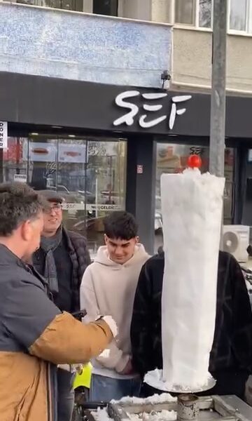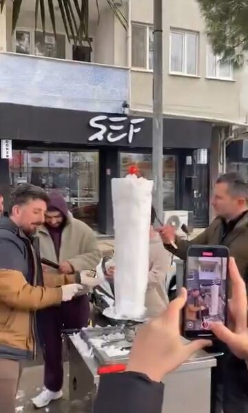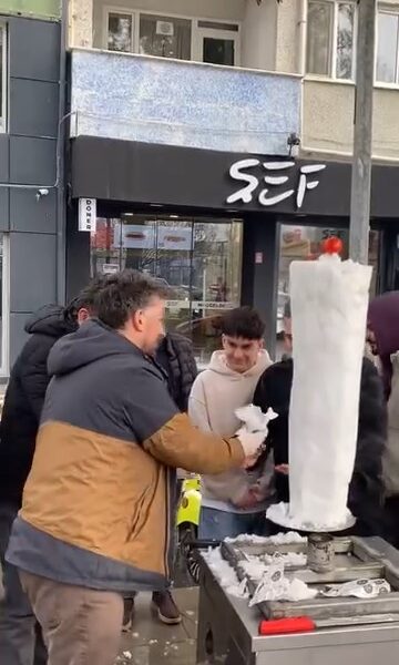 Bursa’nın İnegöl ilçesine bağlı Cuma Mahallesi Atatürk Bulvarı üzerinde faaliyet gösteren bir döner işletmesinin sahibi Gökhan Güneş (35), kar yağışını fırsat bilip sıra dışı bir etkinlik gerçekleştirdi. Topladığı kar kütlesini döner şişine takan Güneş, iş yerinin önünde toplanan vatandaşlara kardan döner ikramında bulundu. Renkli görüntülerin ortaya çıktığı etkinlik, çevredeki vatandaşların yoğun ilgisini çekti. O anları cep telefonlarıyla kaydeden vatandaşlar, şaşkınlıklarını gizlemedi.