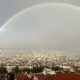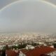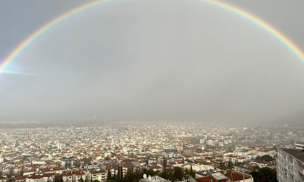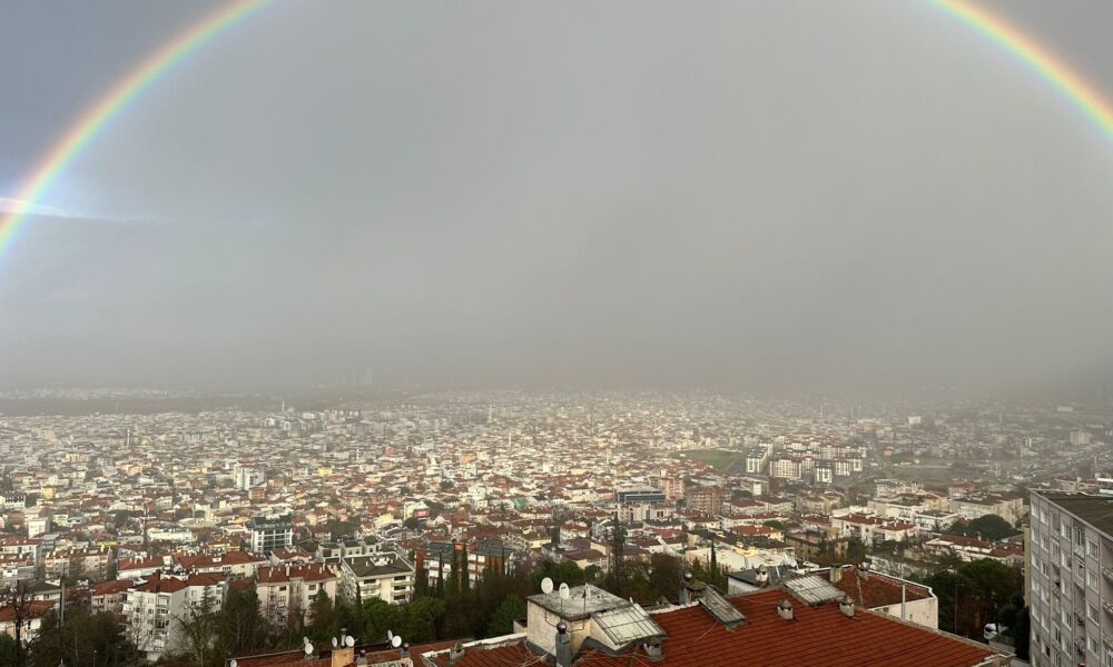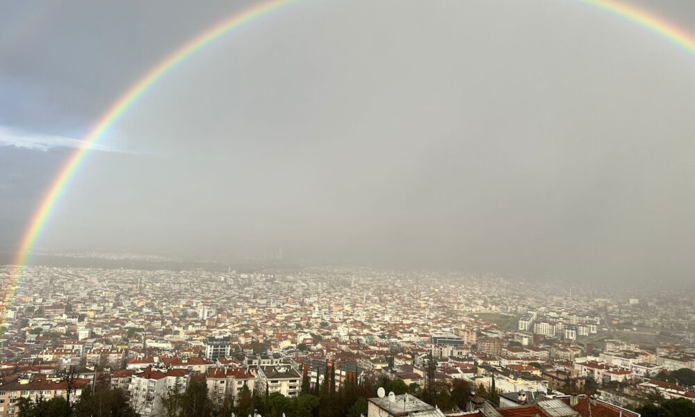 Kentte öğle saatlerinde etkili olan kısa süreli sağanak yağış, yerini güneşli bir havaya bıraktı. Yağmurun ardından gökyüzünde beliren ve kentin bir ucundan diğer ucuna uzanan gökkuşağı, Çekirge yamaçlarından görüldü. Alçak bulutların ve hafif sis tabakasının şehir merkezini kapladığı anlarda ortaya çıkan bu doğa olayı, Bursa’yı bir kar küresinin içindeymiş gibi gösterdi.