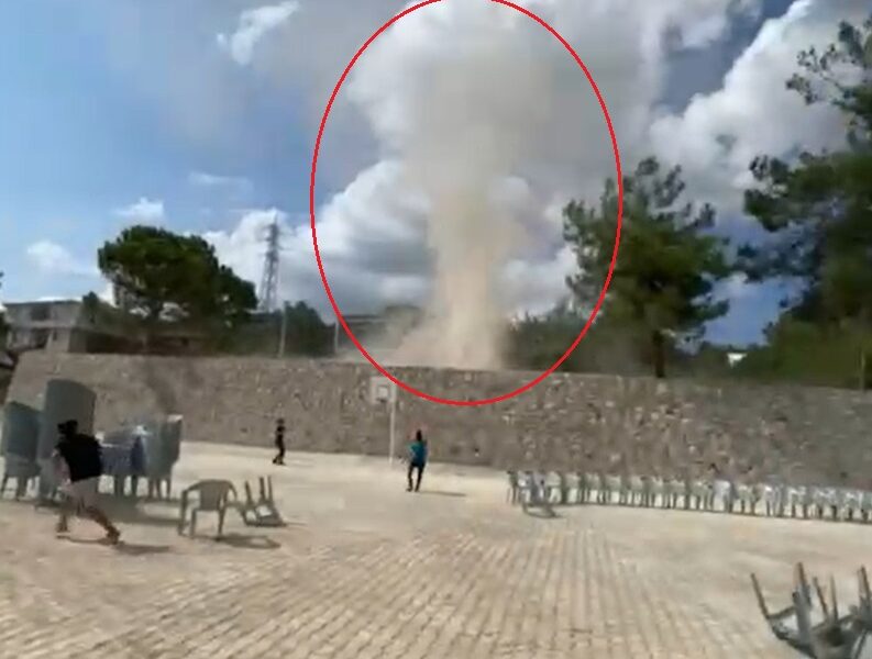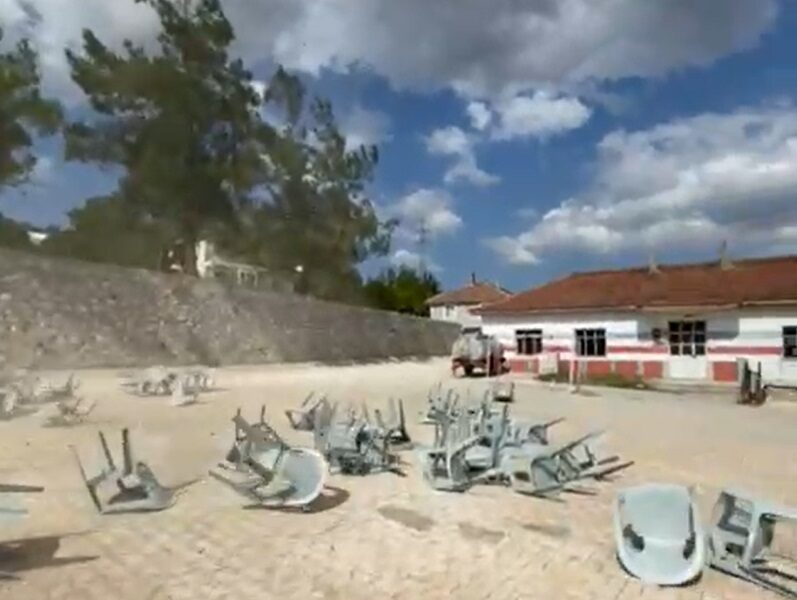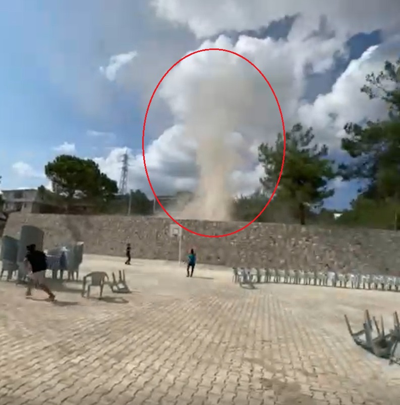 Olay, dün ilçenin Marmaracık Mahallesi’nde meydana geldi. Mahalle meydanında yapılacak düğün için hazırlıklar sürerken, aniden çıkan hortum, sıralanan plastik sandalyeleri uçurdu. Havalanan sandalyeler etrafa savrulurken, o anlar çevredekilerin cep telefonu kamerasıyla kaydedildi.