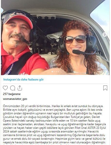 “Ömrümüzden 20 yıl verdik birbirimize. Harika iki erkek evlat sunduk bu dünyaya. Birlikte aynı kokpiti, gökyüzünü ve evreni paylaştık. Ben uçma aşkını ilk kez onda gördüm, ondan öğrendim uçmanın nasıl eşsiz bir mutluluk getirdiğini bu hayata. Çocukluk hayali için doğup büyüdüğü Bulgaristan’dan Türkiye’ye gelen, Devlet Opera Balesindeki sanatçı kadrosundan istifa eden ve 10 bin saatten fazla uçuş saatini zirai ilaçlamadan, akrobasi, hava yolu ve uçuş öğretmenliğine kadar başarıyla yürüten ve hayatı haber olan çeşitli ödüllere layık görülen pilot Ünal Aster, 23 Eylül 2024 sabah saatlerinde eğitim uçuşu sırasında aramızdan ayrılmıştır. Havacılık camiasına binlerce pilot ve uçuş öğretmeni kazandırmış, oğullarına başarılarla dolu gurur ve emek dolu bir soyadı bırakmıştır. Hepimize giyim tarzı ve genel kültürü ile neşesiyle havacılıkta eşsiz bambaşka bir pilot olmanın nasıl olunacağını öğretmiştir. Aşık olduğu gökyüzünde daimi yerini almıştır. Sevgisi saygısıyla onu yalnız bırakmayan herkese teşekkürler. Onu ilk tanıştığımızda birlikte dinlediğimiz müzikle uğurlamak isterim. Melekler yoldaşın olsun Crazy Baron.”