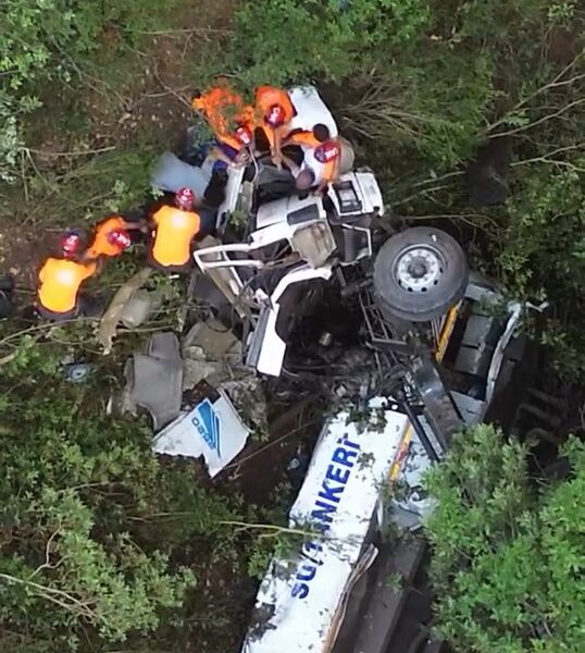 • Gürsu ile Kestel ilçelerindeki orman yangınını söndürme çalışmalarına destek vermek için bölgeye giden su tankeri yamaca düştü. 1 kişi öldü, 2 kişi yaralandı. Fotoğraf: Bursa, (DHA)