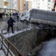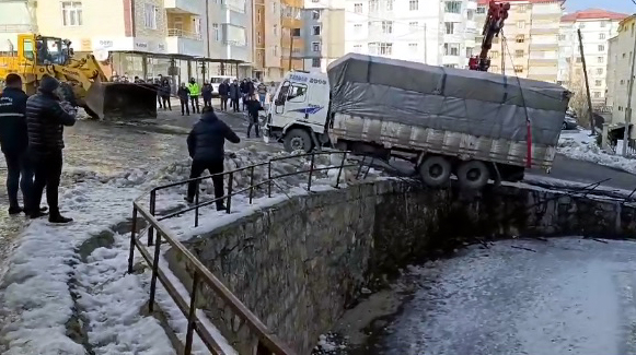 Buzda kayan kamyon, derenin duvarında asılı kaldı