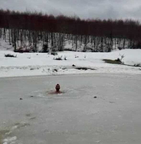 Akyazı’ya bağlı Çiçekli Yaylası’nda göl, dondurucu soğuklar nedeniyle buz tuttu. Dün göle giden Ahmet Hazar, buz tabakasını kırıp, suya girdi. Bir süre suda kalan Hazar, daha sonra gölden çıktı. O anlar, cep telefonuyla görüntülendi.