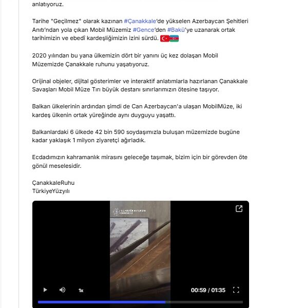 Bakan Ersoy, NSosyal hesabından yaptığı açıklamada, “Tarihin seyrini değiştiren milletimizin kahramanlık destanını dünyaya anlatıyoruz. Tarihe Geçilmez olarak kazınan Çanakkalede yükselen Azerbaycan Şehitleri Anıtından yola çıkan Mobil Müzemiz Genceden Baküye uzanarak ortak tarihimizin ve ebedi kardeşliğimizin izini sürdü. 2020 yılından bu yana ülkemizin dört bir yanını üç kez dolaşan Mobil Müzemizde Çanakkale ruhunu yaşatıyoruz. Orijinal objeler, dijital gösterimler ve interaktif anlatımlarla hazırlanan Çanakkale Savaşları Mobil Müze TIRı büyük destanı sınırlarımızın ötesine taşıyor” ifadelerini kullandı.