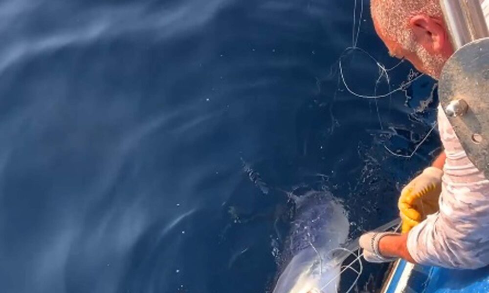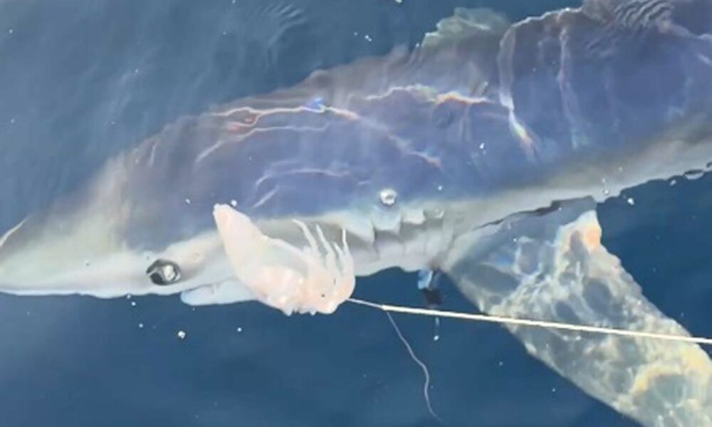 Çanakkale’de 100 kiloluk mavi köpek balığı, balıkçıların oltasına takıldı