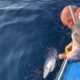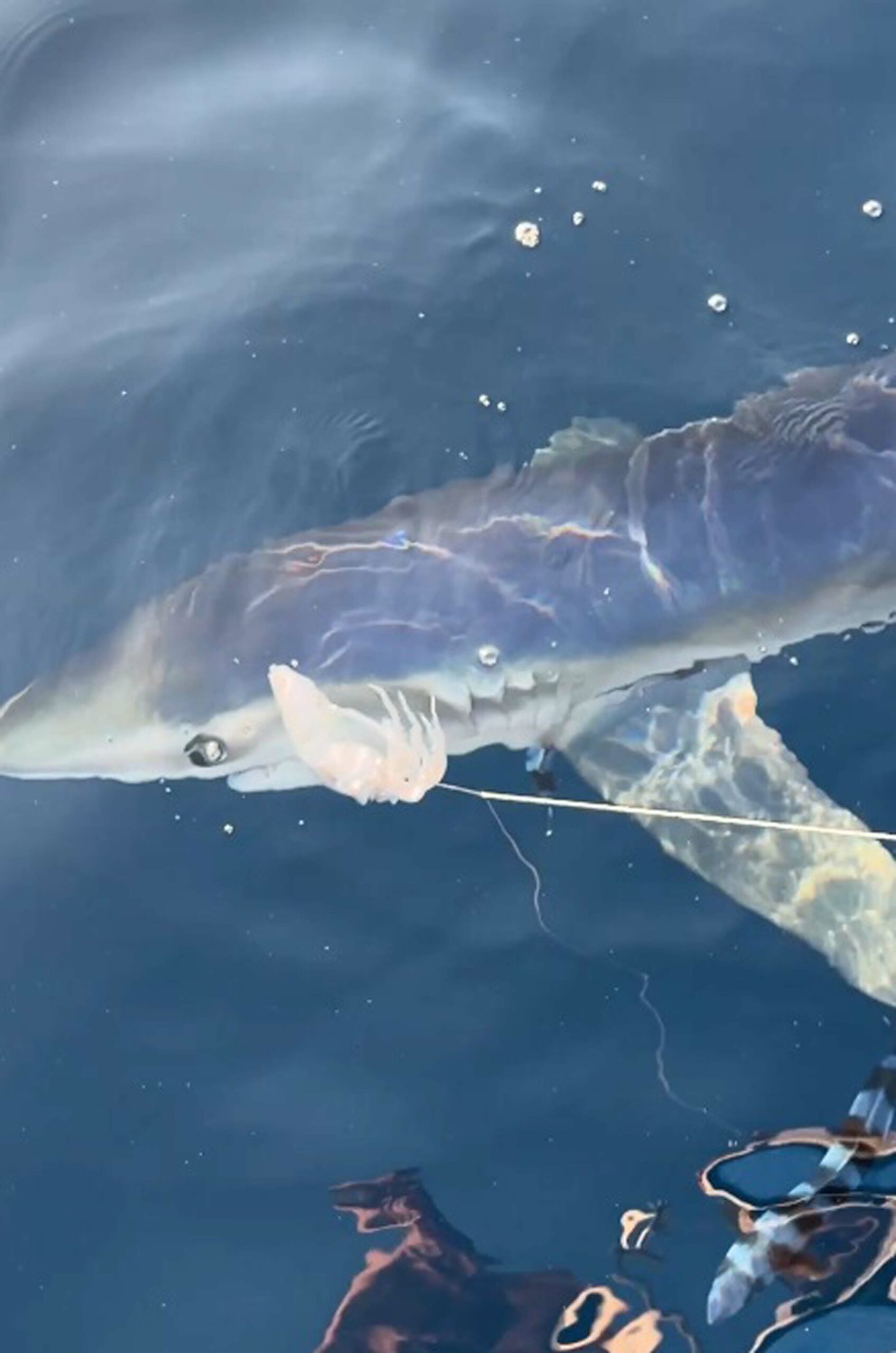 Gökçeadada balıkçılık yapan İlker Özdemir, dün balık avlamak için teknesiyle denize açıldı. Parakete takımlarını denize bırakan Özdemir ve arkadaşları, bir süre sonra takımları toplamaya başladı. Özdemir, parakete takımı çekilirken içinde dev bir balık olduğunu gördü. Yüzeye yaklaşan balığın mavi köpek balığı olduğunu fark eden balıkçılar şaşkınlık yaşadı. Yüzeye yaklaştıktan sonra Özdemir oltayı koparıp, yaklaşık 100 kilogram ağırlığında ve 2,5 metre boyundaki mavi köpek balığını doğal ortamına bıraktı. Özdemir ve arkadaşları o anları cep telefonu kamerasıyla kaydetti.