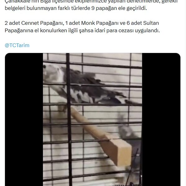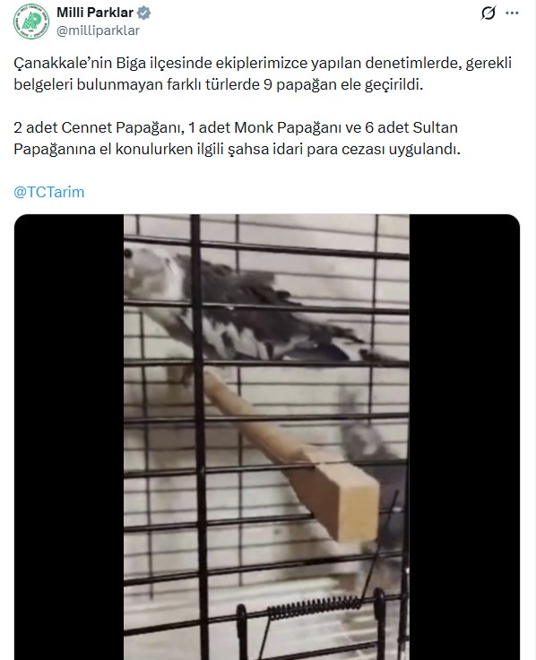 DKMP Genel Müdürlüğünün sanal medya hesabından yapılan açıklamaya göre; Çanakkale’nin Biga ilçesinde DKMP ekiplerince yapılan denetimlerde, gerekli belgeleri bulunmayan farklı türlerde 9 papağan ele geçirildi. 2 adet Cennet Papağanı, 1 adet Monk Papağanı ve 6 adet Sultan Papağanına el konulurken, ilgili kişiye idari para cezası uygulandı.
