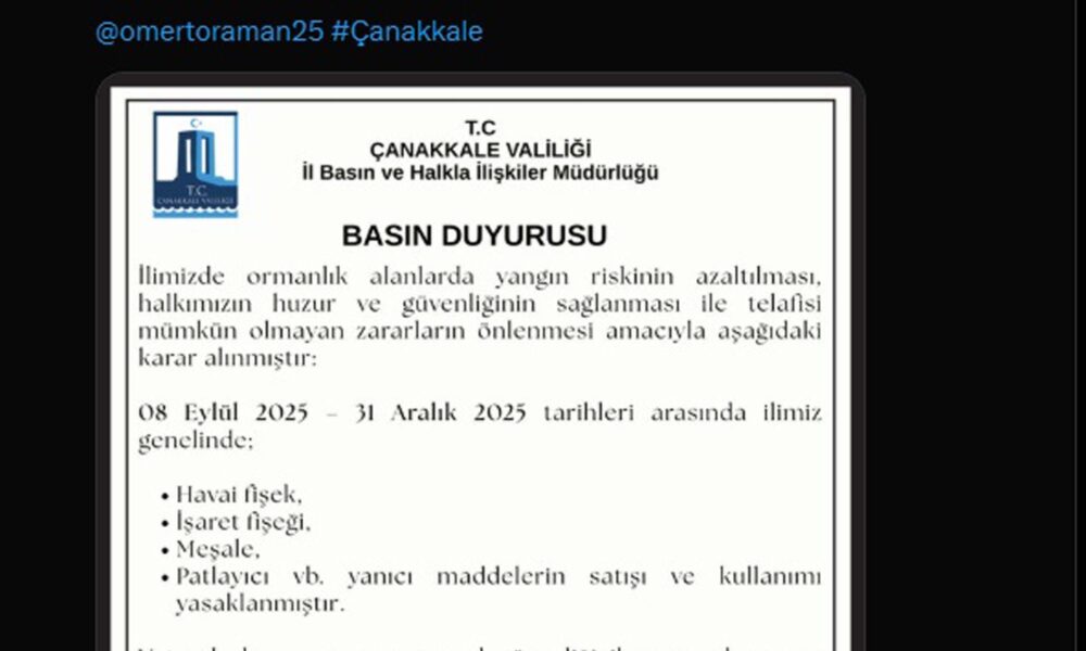 Çanakkale Valiliği, il genelinde artan orman yangınların önüne geçmek için yeni tedbirler aldı. Buna göre il genelinde 08 Eylül itibarıyla 31 Aralık 2025 tarihleri arasında havai fişek, işaret fişeği, meşale, patlayıcı ve benzeri yanıcı maddelerin satışı ve kullanımı yasaklandı. Çanakkale Valiliği’nin sosyal medya hesabında yapılan paylaşımda, “İlimizde ormanlık alanlarda yangın riskinin azaltılması, halkımızın huzur ve güvenliğinin sağlanması ile telafisi mümkün olmayan zararların önlenmesi amacıyla aşağıdaki karar alınmıştır: 08 Eylül 2025 31 Aralık 2025 tarihleri arasında ilimiz genelinde; havai fişek, işaret fişeği, meşale, patlayıcı vb. yanıcı maddelerin satışı ve kullanımı yasaklanmıştır. Vatandaşlarımızın can ve mal güvenliği ile ormanlarımızın korunması amacıyla alınan bu karara titizlikle riayet edilmesi önem arz etmektedir” denildi.