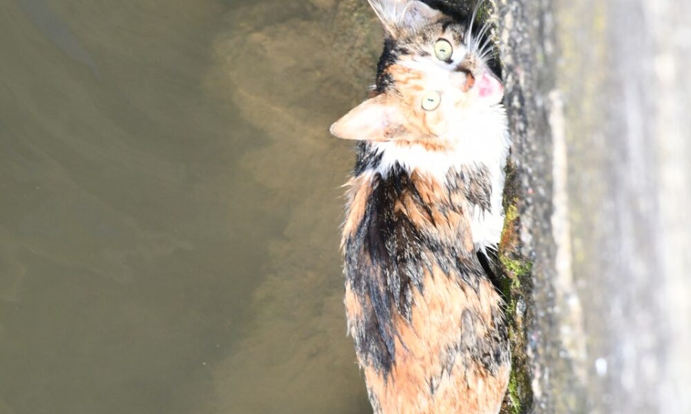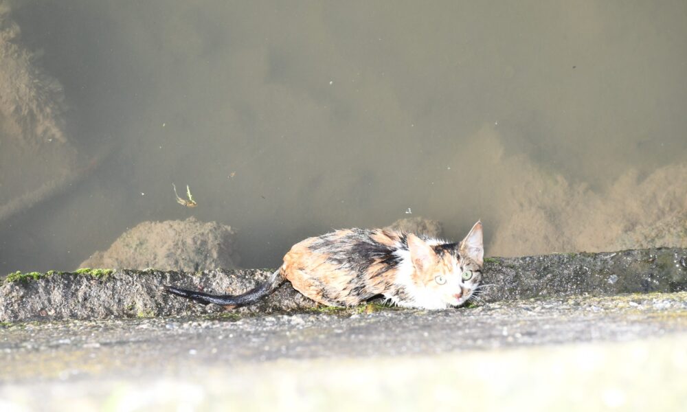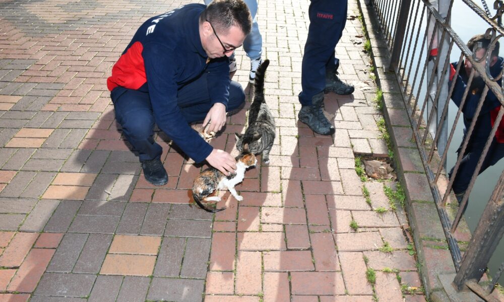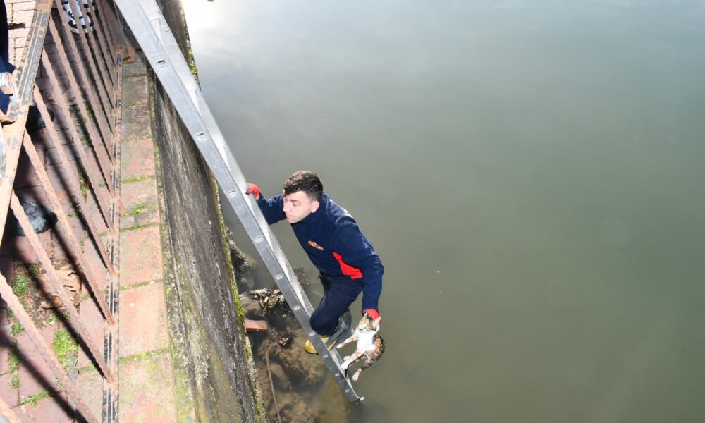 Çaya düşen yavru kedi, itfaiye tarafından kurtarıldı