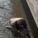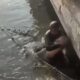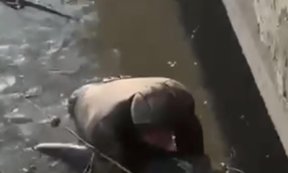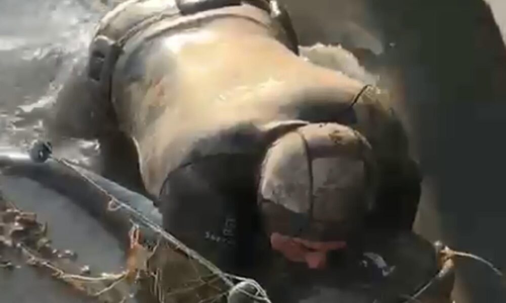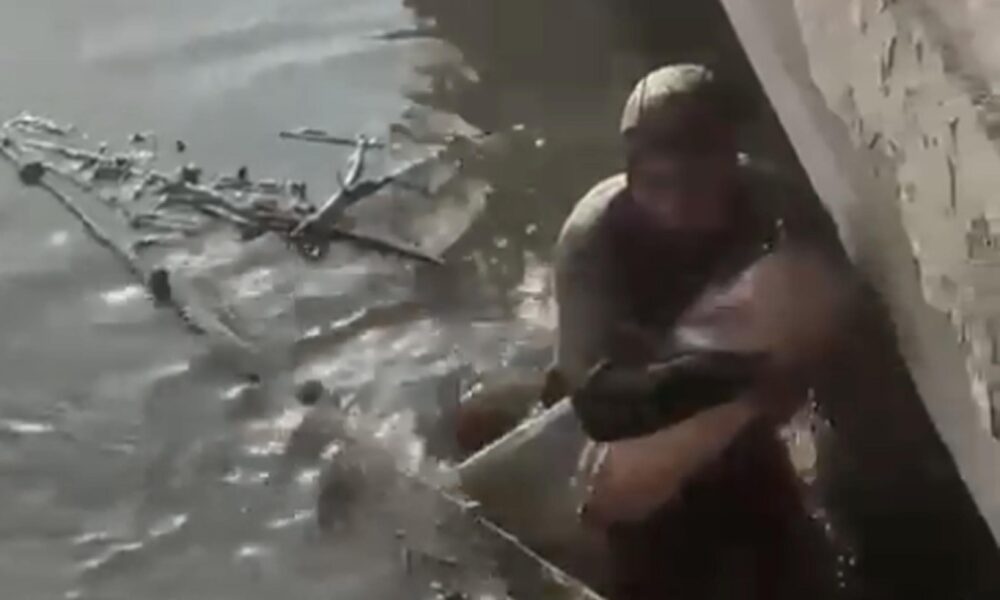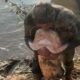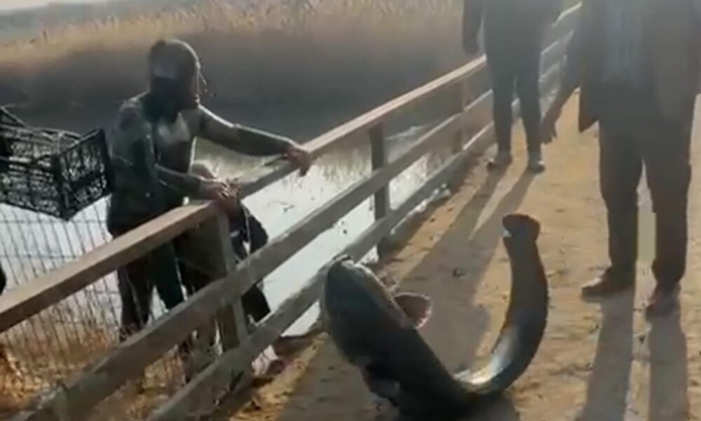 Çayda eliyle yakaladığı yayın balığını güçlükle sudan çıkardı