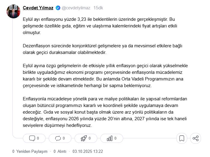 Cumhurbaşkanı Yardımcısı Cevdet Yılmaz, eylül ayı enflasyon verilerine ilişkin NSosyal hesabından açıklama yaptı. Yılmaz, “Eylül ayı enflasyonu yüzde 3,23 ile beklentilerin üzerinde gerçekleşmiştir. Bu gelişmede özellikle gıda, eğitim ve ulaştırma kalemlerindeki fiyat artışları etkili olmuştur. Dezenflasyon sürecinde konjonktürel gelişmelere ya da mevsimsel etkilere bağlı olarak geçici duraksamalar olabilmektedir. Eylül ayına özgü gelişmelerin de etkisiyle yıllık enflasyon geçici olarak yükselmekle birlikte uyguladığımız ekonomi programı çerçevesinde enflasyonla mücadelemiz kararlı bir şekilde devam etmektedir. Bu anlamda Orta Vadeli Programımızın ana çerçevesinde ve istikametinde herhangi bir sapma beklemiyoruz. Enflasyonla mücadeleye yönelik para ve maliye politikaları ile yapısal reformlardan oluşan bütüncül programımızı kararlı ve koordineli şekilde uygulamaya devam edeceğiz. Gıda ve sosyal konut başta olmak üzere arz yönlü politikaların da desteğiyle, enflasyonu 2026 yılında yüzde 20nin altına, 2027 yılında ise tek haneli seviyelere düşürmeyi hedefliyoruz” dedi.