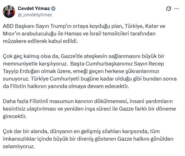 Cumhurbaşkanı Yardımcısı Cevdet Yılmaz, Gazzede sağlanan ateşkese ilişkin sosyal medya hesabından açıklama yaptı. Yılmaz, “ABD Başkanı Sayın Trumpın ortaya koyduğu plan, Türkiye, Katar ve Mısırın ara buluculuğu ile Hamas ve İsrail temsilcileri tarafından müzakere edilerek kabul edildi. Çok geç kalmış olsa da Gazze’de ateşkesin sağlanmasını büyük bir memnuniyetle karşılıyoruz. Başta Cumhurbaşkanımız Sayın Recep Tayyip Erdoğan olmak üzere, emeği geçen herkese şükranlarımızı sunuyoruz. Türkiye Cumhuriyeti bugüne kadar olduğu gibi bundan sonra da Filistin halkının yanında olmaya devam edecektir. Daha fazla Filistinli masumun kanının dökülmemesi, insani yardımların kesintisiz ulaştırılması ve yeniden inşa süreci ile Gazze farklı bir döneme girecektir. Çok dar bir alanda, dünyanın en gelişmiş silahları karşısında, tüm imkansızlıklar içinde büyük bir direniş gösteren Gazze halkını gönülden selamlıyoruz” ifadelerini kullandı.