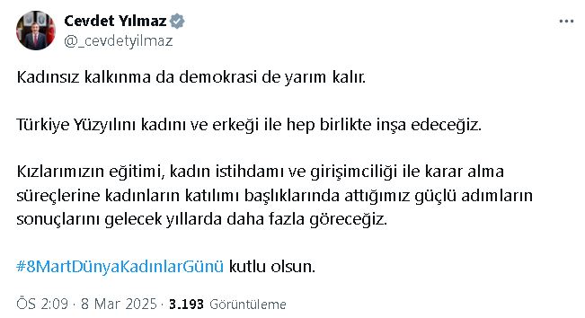 Cumhurbaşkanı Yardımcısı Cevdet Yılmaz, 8 Mart Dünya Kadınlar Günü dolayısıyla sosyal medya hesabından paylaştığı mesajında, “Kadınsız kalkınma da demokrasi de yarım kalır. Türkiye Yüzyılını kadını ve erkeği ile hep birlikte inşa edeceğiz. Kızlarımızın eğitimi, kadın istihdamı ve girişimciliği ile karar alma süreçlerine kadınların katılımı başlıklarında attığımız güçlü adımların sonuçlarını gelecek yıllarda daha fazla göreceğiz. 8 Mart Dünya Kadınlar Günü kutlu olsun” dedi.