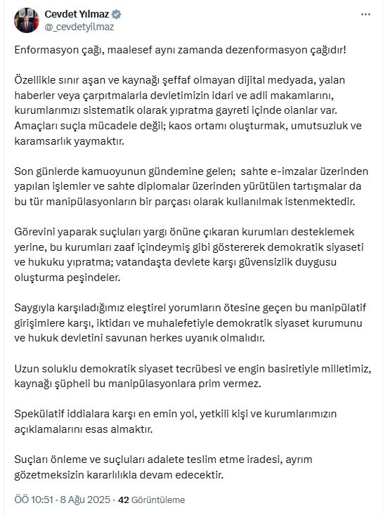 Cumhurbaşkanı Yardımcısı Cevdet Yılmaz, sahte e-imza soruşturması üzerinden yürütülen tartışmalara ilişkin sosyal medya hesabından açıklama yaptı. Yılmaz, “Enformasyon çağı, maalesef aynı zamanda dezenformasyon çağıdır. Özellikle sınır aşan ve kaynağı şeffaf olmayan dijital medyada, yalan haberler veya çarpıtmalarla devletimizin idari ve adli makamlarını, kurumlarımızı sistematik olarak yıpratma gayreti içinde olanlar var. Amaçları suçla mücadele değil; kaos ortamı oluşturmak, umutsuzluk ve karamsarlık yaymaktır. Son günlerde kamuoyunun gündemine gelen; sahte e-imzalar üzerinden yapılan işlemler ve sahte diplomalar üzerinden yürütülen tartışmalar da bu tür manipülasyonların bir parçası olarak kullanılmak istenmektedir” dedi.
