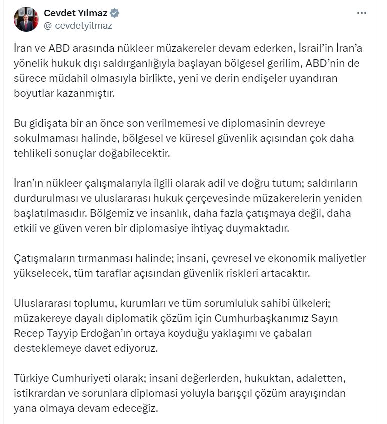 Cumhurbaşkanı Yardımcısı Cevdet Yılmaz, sosyal medya hesabından yaptığı açıklamada, “İran ve ABD arasında nükleer müzakereler devam ederken, İsrailin İrana yönelik hukuk dışı saldırganlığıyla başlayan bölgesel gerilim, ABDnin de sürece müdahil olmasıyla birlikte, yeni ve derin endişeler uyandıran boyutlar kazanmıştır. Bu gidişata bir an önce son verilmemesi ve diplomasinin devreye sokulmaması halinde, bölgesel ve küresel güvenlik açısından çok daha tehlikeli sonuçlar doğabilecektir. İranın nükleer çalışmalarıyla ilgili olarak adil ve doğru tutum; saldırıların durdurulması ve uluslararası hukuk çerçevesinde müzakerelerin yeniden başlatılmasıdır. Bölgemiz ve insanlık, daha fazla çatışmaya değil, daha etkili ve güven veren bir diplomasiye ihtiyaç duymaktadır” dedi.