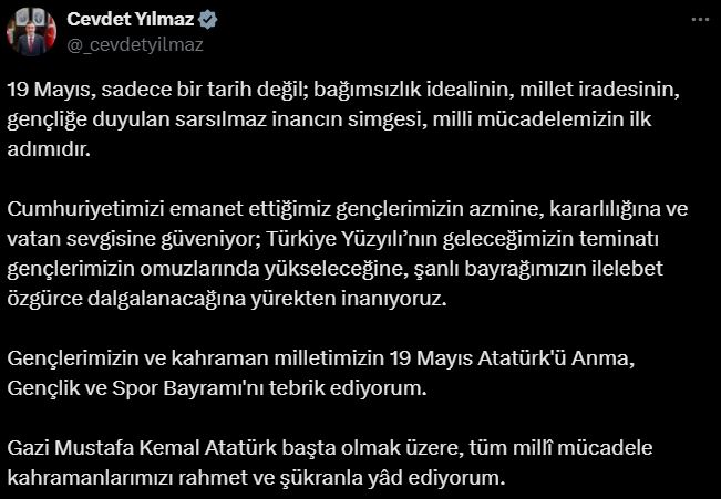 Cumhurbaşkanı Yardımcısı Cevdet Yılmaz, 19 Mayıs Atatürkü Anma, Gençlik ve Spor Bayramı nedeniyle sosyal medya hesabından yaptığı paylaşımda, “19 Mayıs sadece bir tarih değil; bağımsızlık idealinin, millet iradesinin, gençliğe duyulan sarsılmaz inancın simgesi, milli mücadelemizin ilk adımıdır. Cumhuriyetimizi emanet ettiğimiz gençlerimizin azmine, kararlılığına ve vatan sevgisine güveniyor; Türkiye Yüzyılının geleceğimizin teminatı gençlerimizin omuzlarında yükseleceğine, şanlı bayrağımızın ilelebet özgürce dalgalanacağına yürekten inanıyoruz. Gençlerimizin ve kahraman milletimizin 19 Mayıs Atatürkü Anma, Gençlik ve Spor Bayramını tebrik ediyorum. Gazi Mustafa Kemal Atatürk başta olmak üzere, tüm milli mücadele kahramanlarımızı rahmet ve şükranla yad ediyorum” ifadelerini kullandı.