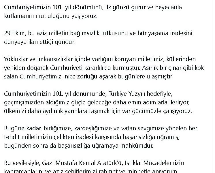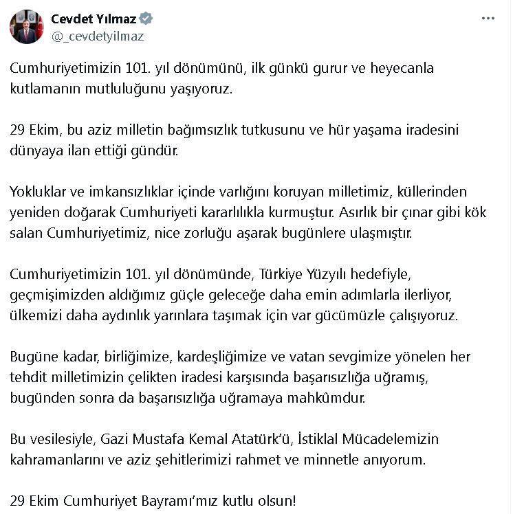 Cevdet Yılmaz, 29 Ekim Cumhuriyet Bayramı dolayısıyla sosyal medya hesabından paylaştığı mesajda, “Cumhuriyetimizin 101inci yıl dönümünü, ilk günkü gurur ve heyecanla kutlamanın mutluluğunu yaşıyoruz. 29 Ekim, bu aziz milletin bağımsızlık tutkusunu ve hür yaşama iradesini dünyaya ilan ettiği gündür. Yokluklar ve imkansızlıklar içinde varlığını koruyan milletimiz, küllerinden yeniden doğarak Cumhuriyeti kararlılıkla kurmuştur. Asırlık bir çınar gibi kök salan Cumhuriyetimiz, nice zorluğu aşarak bugünlere ulaşmıştır. Cumhuriyetimizin 101inci yıl dönümünde, Türkiye Yüzyılı hedefiyle, geçmişimizden aldığımız güçle geleceğe daha emin adımlarla ilerliyor, ülkemizi daha aydınlık yarınlara taşımak için var gücümüzle çalışıyoruz. Bugüne kadar, birliğimize, kardeşliğimize ve vatan sevgimize yönelen her tehdit milletimizin çelikten iradesi karşısında başarısızlığa uğramış, bugünden sonra da başarısızlığa uğramaya mahkumdur. Bu vesilesiyle, Gazi Mustafa Kemal Atatürkü, İstiklal Mücadelemizin kahramanlarını ve aziz şehitlerimizi rahmet ve minnetle anıyorum. 29 Ekim Cumhuriyet Bayramımız kutlu olsun” ifadelerini kullandı.