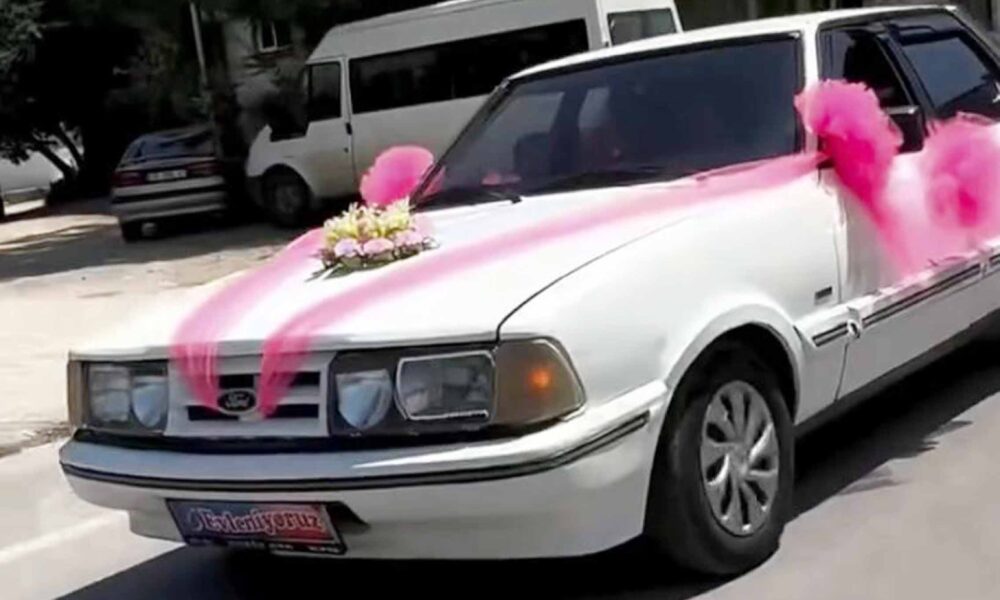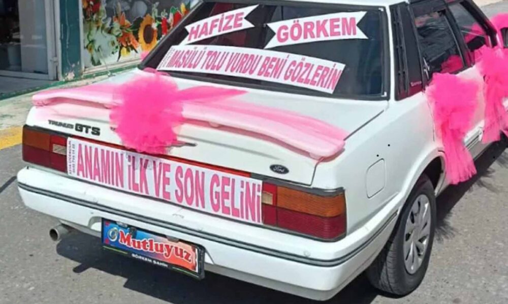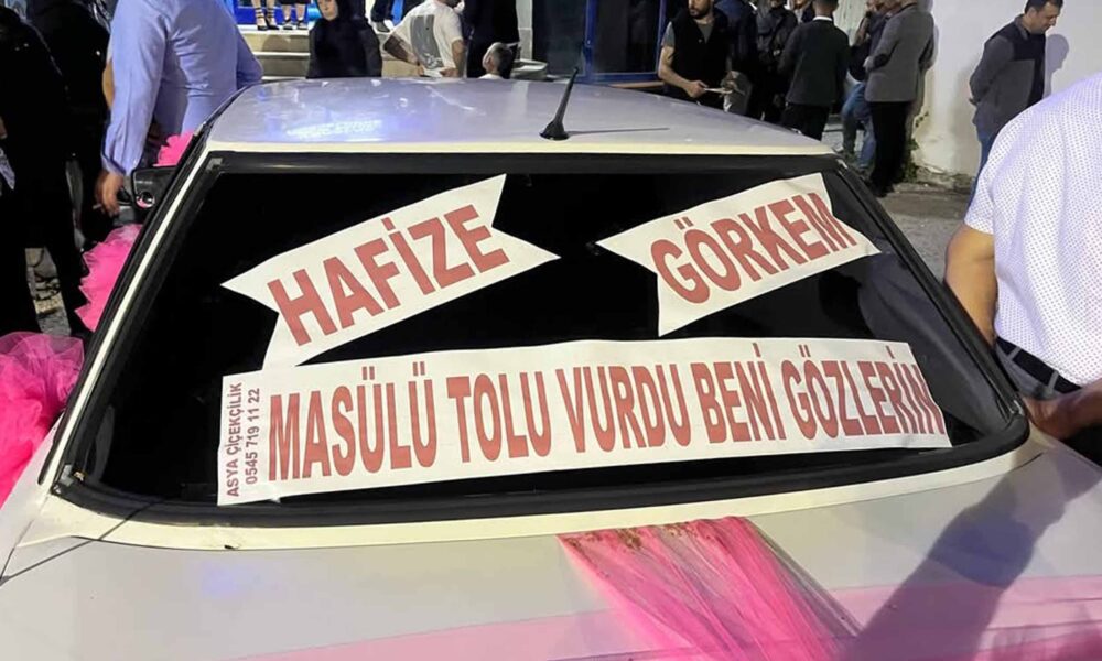 Alacami Mahallesi’nde oturan Görkem Şahinin tarım arazisi, ilçede 2 gün önce yağan doludan zarar gördü. Dün yapılan düğünle dünyaevine giren Şahin, eski model klasik arabasına yöre şivesiyle Masülü tolu vurdu, beni gözlerin yazısı astı. Gelin arabası, düğün konvoyunda yoğun ilgi gördü. Damatlık olarak bölgeye özgü şalvar giyen Görkem ve Hafize Şahin çiftinin gelin arabasındaki yazı, görenleri gülümsetti.