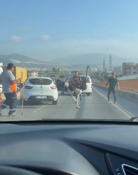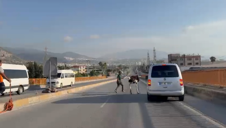 İskenderun ilçesinde bir çiftlikten sabah saatlerinde kaçan deve kuşu, Profesör Muammer Aksoy Caddesinde araçların arasında koşmaya başladı. Deve kuşunu görünce şaşkınlık yaşayan vatandaşlar, cep telefonuyla o anları görüntüledi. Trafik güvenliğini tehlikeye atan deve kuşu, sahibi tarafından güçlükle yakalanıp, iple bağlanarak hafif ticari araca konulup, çiftliğe götürüldü.