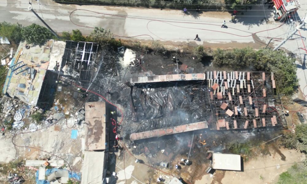 • Kocaeli'nin Gebze ilçesindeki bir yediemin deposunda çıkan yangın, itfaiye ekipleri tarafından söndürüldü. Yanan depo dronla havadan görüntülendi. Fotoğraf: Gebze(Kocaeli), (DHA)