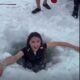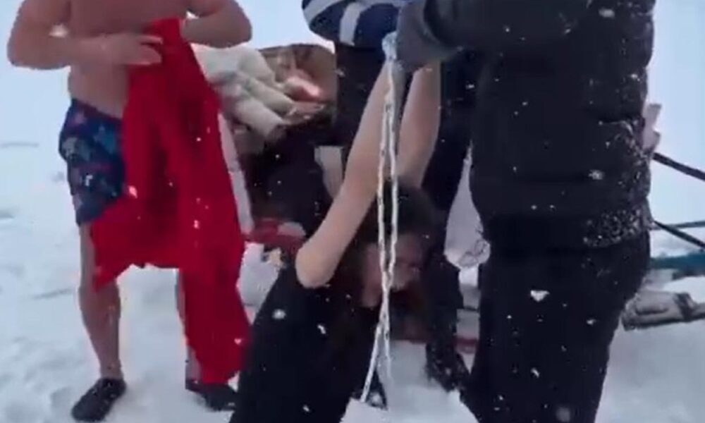 Bir süre sonra da Hayriye Çetin, kızakçıların yardımıyla suya girdi. Bir süre suda bekleyen Çetin, ardından dalıp çıktı.