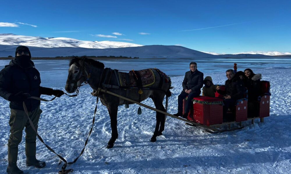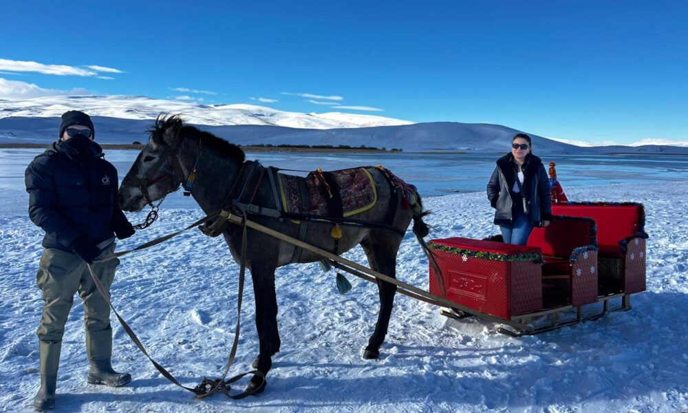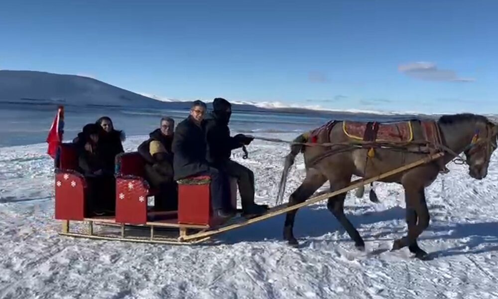 Gölde donmanın başlamasıyla birlikte atlı kızaklar ve kar motorları hazır hale getirildi. Buz kalınlığının henüz istenilen düzeyde olmaması sebebiyle bölgeye gelen misafirler göl kenarında tur attırılıyor. Fotoğraf: Suat İNCEDERE / Arpaçay(Kars),(DHA