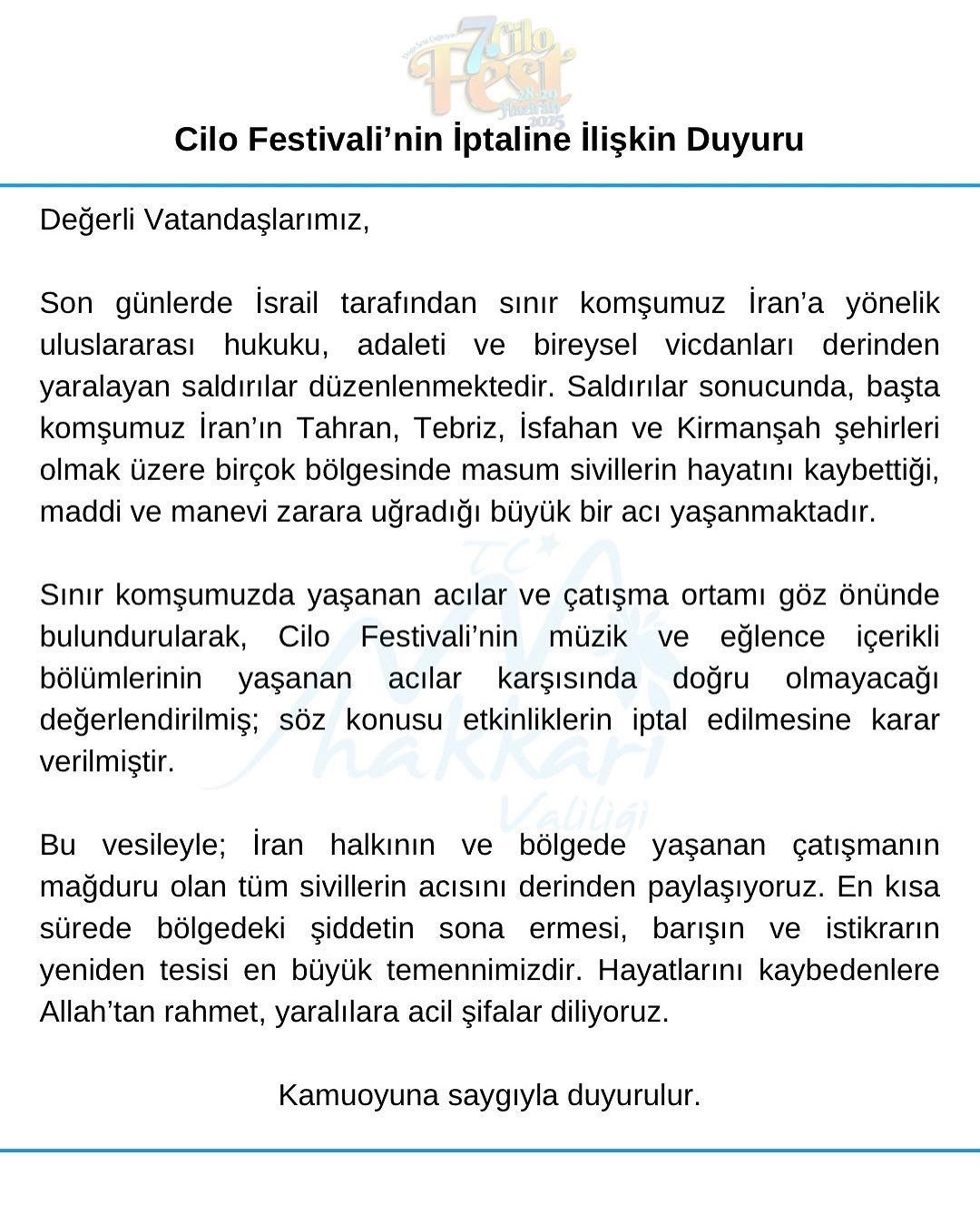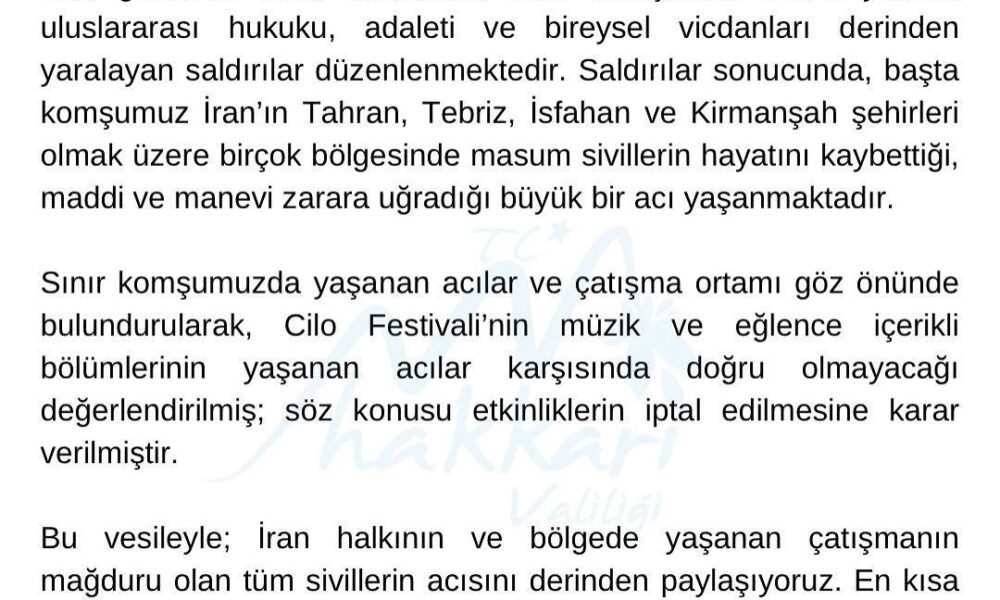 Hakkari Valiliği, Cilo Festivali ile ilgili açıklama yaptı. Valilikten yapılan açıklamada, “Son günlerde İsrail tarafından sınır komşumuz İrana yönelik uluslararası hukuku, adaleti ve bireysel vicdanları derinden yaralayan saldırılar düzenlenmektedir. Saldırılar sonucunda, başta komşumuz İranın Tahran, Tebriz, İsfahan ve Kirmanşah şehirleri olmak üzere birçok bölgesinde masum sivillerin hayatını kaybettiği, maddi ve manevi zarara uğradığı büyük bir acı yaşanmaktadır. Sınır komşumuzda yaşanan acılar ve çatışma ortamı göz önünde bulundurularak, Cilo Festivalinin müzik ve eğlence içerikli bölümlerinin yaşanan acılar karşısında doğru olmayacağı değerlendirilmiş; söz konusu etkinliklerin iptal edilmesine karar verilmiştir. Bu vesileyle; İran halkının ve bölgede yaşanan çatışmanın mağduru olan tüm sivillerin acısını derinden paylaşıyoruz. En kısa sürede bölgedeki şiddetin sona ermesi, barışın ve istikrarın yeniden tesisi en büyük temennimizdir. Hayatlarını kaybedenlere Allahtan rahmet, yaralılara acil şifalar diliyoruz” denildi.