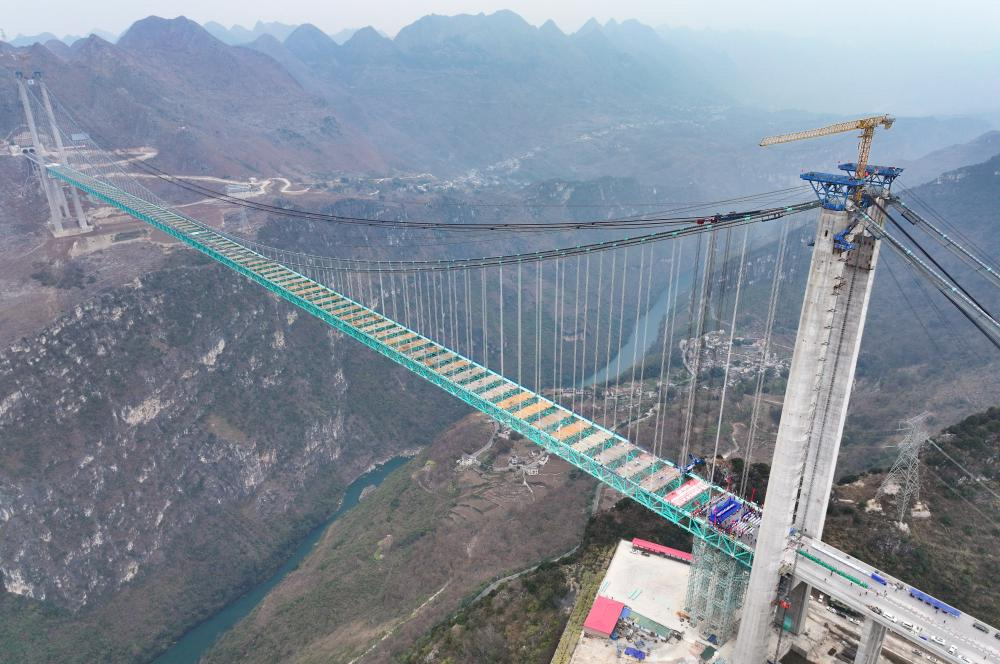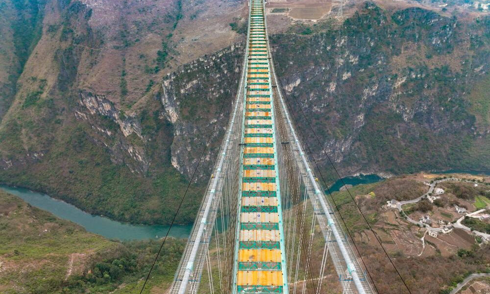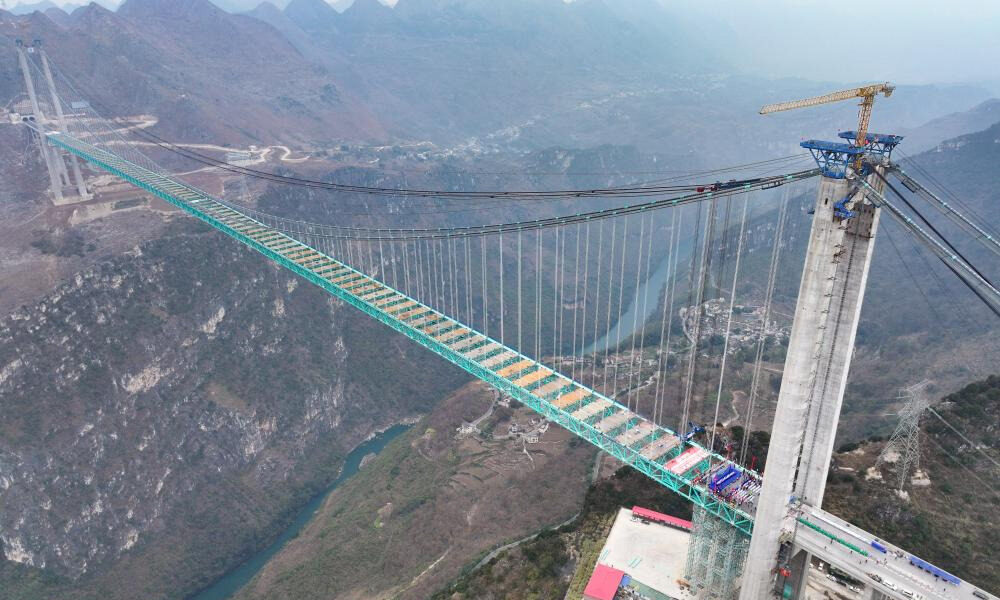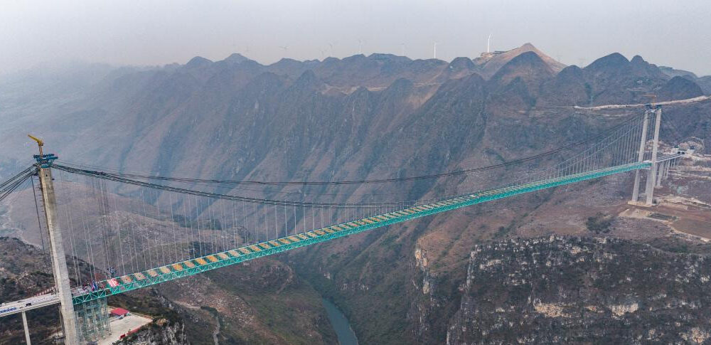 Çinin güneybatısındaki Guizhou eyaletinde inşa edilen Huajiang Büyük Kanyon Köprüsünün ana yapısının tamamlandığı açıklandı. Beipan Nehri üzerinde yer alan ve 625 metre yüksekliğiyle dünyanın en yüksek köprüsü unvanını taşıyacak olan yapı, 1 bin 420 metre ana açıklığa ve 2 bin 890 metre toplam uzunluğa sahip. Ocak 2022’de başlayan projenin bu yıl tamamlanması planlanıyor.