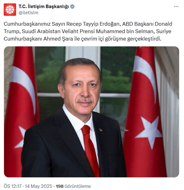 İletişim Başkanlığından yapılan yazılı açıklamaya göre; Cumhurbaşkanı Recep Tayyip Erdoğan, ABD, Suudi Arabistan ve Suriye liderleriyle, Cumhurbaşkanlığı Külliyesinden çevrim içi toplantıya katıldı. Cumhurbaşkanı Erdoğan toplantıda Türkiyenin, Suriyenin bölge ülkeleri ile birlikte çalışan, komşularına tehdit oluşturmayan, istikrarlı, refah üreten bir ülke olmasını arzuladığını ve bunun için gayret gösterdiğini ifade etti. Şam yönetiminin DEAŞ başta olmak üzere terör örgütleriyle mücadelesinde Türkiyenin destek vermeye devam edeceğini, DEAŞlı teröristlerin tutulduğu tutukevlerinin yönetimi ve güvenliği konusunda da desteğe hazır olduğunu belirten Cumhurbaşkanı Erdoğan, ABD Başkanı Donald Trumpın Suriyeye yönelik yaptırımların kaldırılması kararının tarihi önemde olduğunu, bu kararın yaptırım uygulayan diğer ülkelere de örnek olacağına inandığını, bu sayede Suriyede çeşitli alanlarda yatırım fırsatları doğacağını dile getirdi.