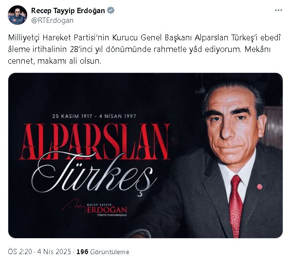 Cumhurbaşkanı Recep Tayyip Erdoğan, sosyal medya hesabından yaptığı açıklamada, “Milliyetçi Hareket Partisinin Kurucu Genel Başkanı Alparslan Türkeşi ebedi aleme irtihalinin 28inci yıl dönümünde rahmetle yad ediyorum. Mekanı cennet, makamı ali olsun” dedi.