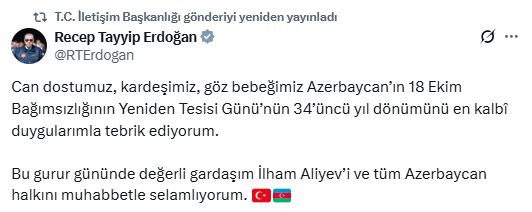 Cumhurbaşkanı Erdoğan, sosyal medya hesabından yaptığı açıklamada, “Can dostumuz, kardeşimiz, göz bebeğimiz Azerbaycanın 18 Ekim Bağımsızlığının Yeniden Tesisi Gününün 34üncü yıl dönümünü en kalbi duygularımla tebrik ediyorum. Bu gurur gününde değerli gardaşım İlham Aliyevi ve tüm Azerbaycan halkını muhabbetle selamlıyorum” dedi.