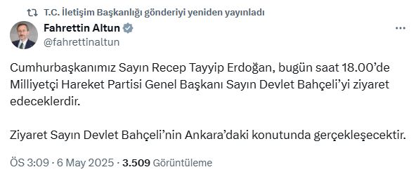 İletişim Başkanı Fahrettin Altun, sosyal medya hesabından yaptığı açıklamada, “Cumhurbaşkanımız Sayın Recep Tayyip Erdoğan, bugün saat 18.00de Milliyetçi Hareket Partisi Genel Başkanı Sayın Devlet Bahçeliyi ziyaret edeceklerdir. Ziyaret, Sayın Devlet Bahçelinin Ankaradaki konutunda gerçekleşecektir” denildi.