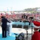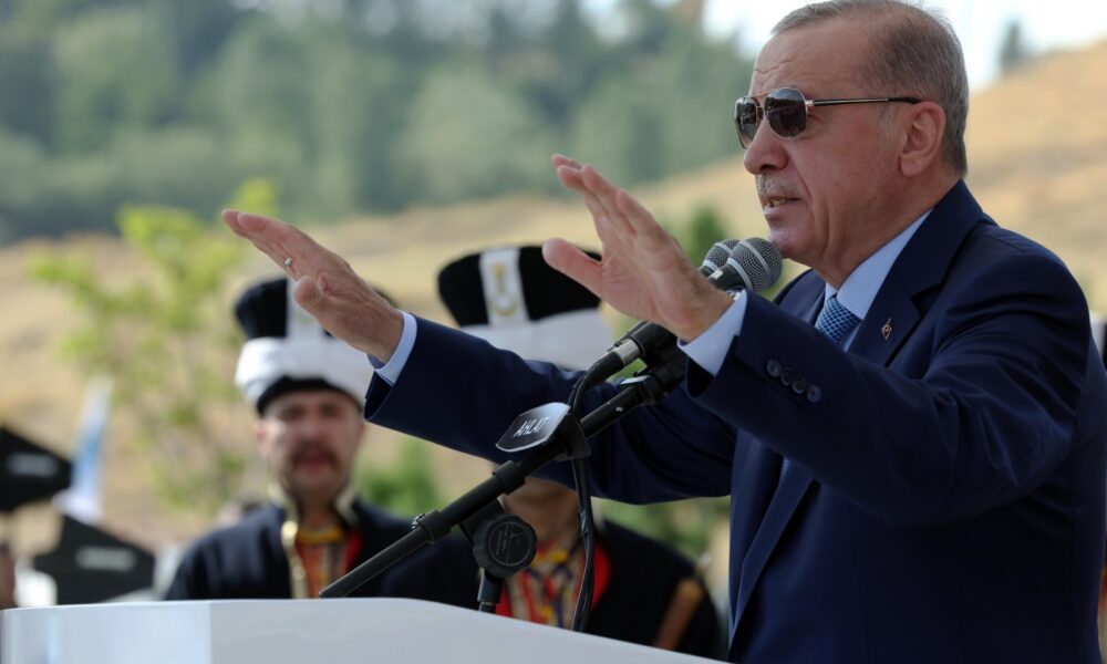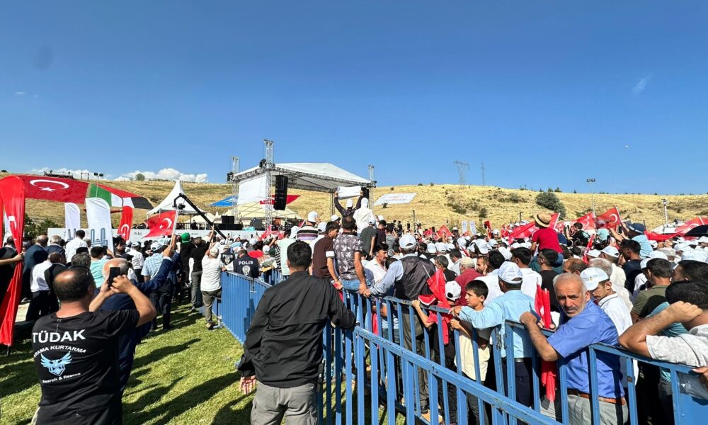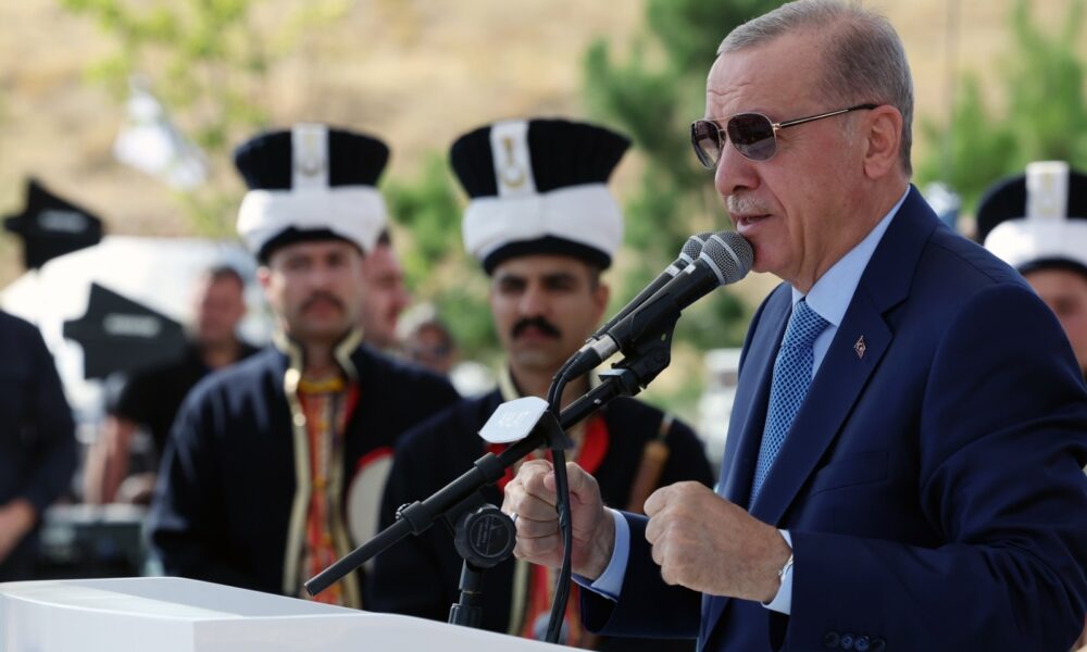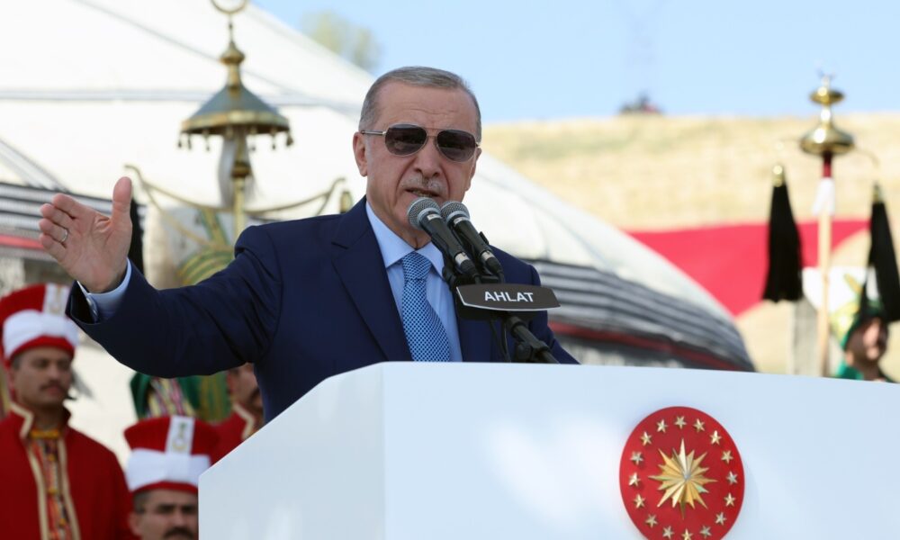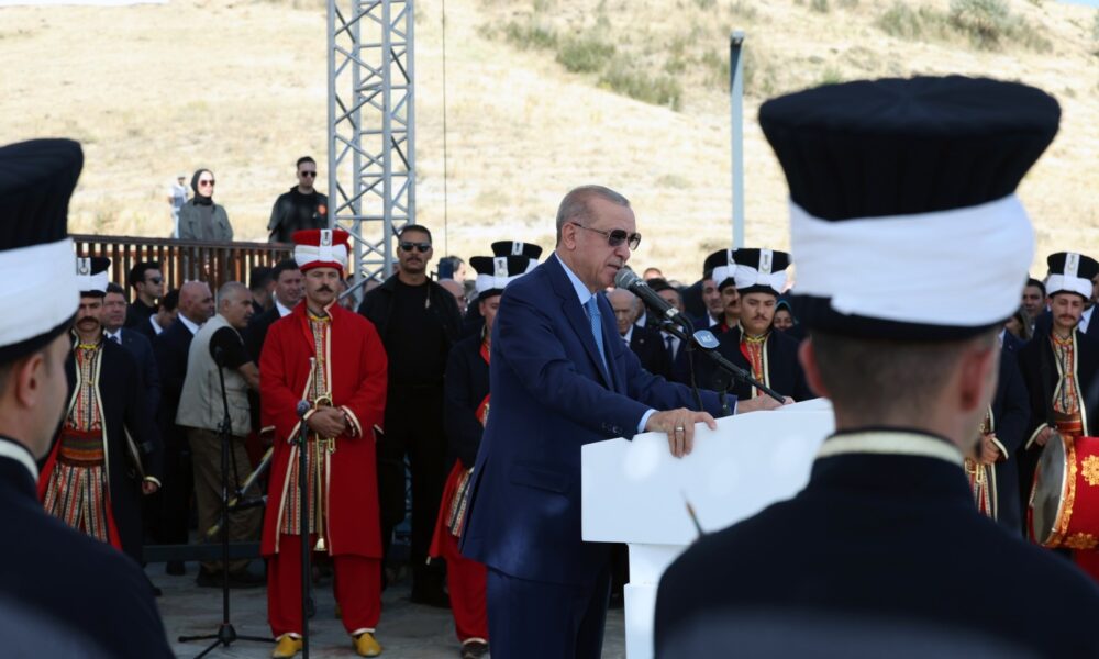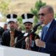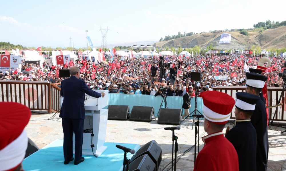 Cumhurbaşkanı Recep Tayyip Erdoğan, Malazgirt Zaferi'nin 953'nci yıl dönümü etkinliklerinin yapıldığı Ahlat ilçesinde millet bahçesi içerisinde bulunan 1071 Sultan Alparslan Otağı'ndaki tören alanında halka hatip etti. Fotoğraf: Gülay KUYUCU/Ahlat(Bitlis)