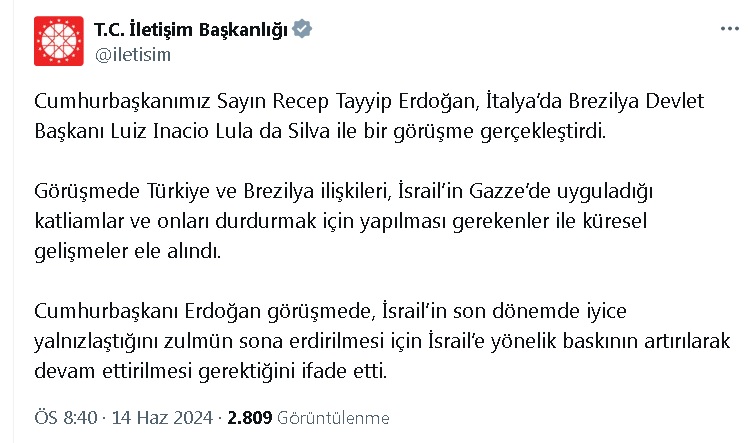 İletişim Başkanlığı sosyal medya hesabından yaptığı paylaşımda, Cumhurbaşkanı Recep Tayyip Erdoğanın G7 Zirvesi’ne katılmak üzere gittiği İtalya’da, Brezilya Devlet Başkanı Luiz Inacio Lula da Silva ile bir görüşme gerçekleştirdiğini bildirdi. Görüşmede Türkiye ve Brezilya ilişkileri ve İsrail- Gazze savaşını durdurmak için yapılması gerekenler ile küresel gelişmeler ele alındığı belirtildi. Yapılan paylaşımda, “Cumhurbaşkanı Erdoğan görüşmede, İsrail’in son dönemde iyice yalnızlaştığını zulmün sona erdirilmesi için İsrail’e yönelik baskının artırılarak devam ettirilmesi gerektiğini ifade etti” ifadeleri kullanıldı.