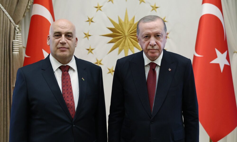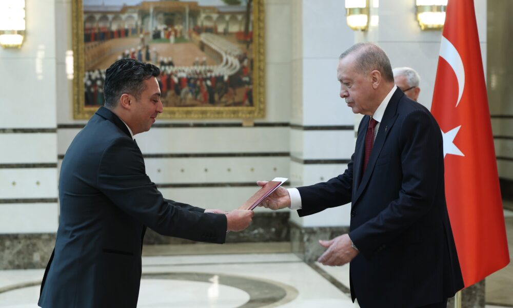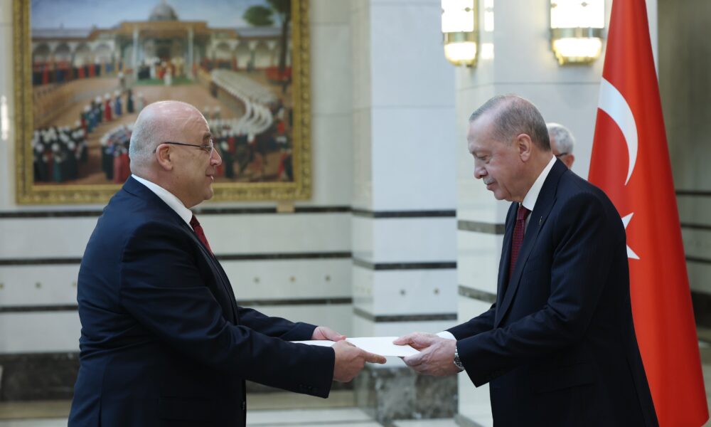 Filistin Büyükelçisi Nasri Khalil Salim Abujaish, Cumhurbaşkanı Recep Tayyip Erdoğan'a güven mektubunu takdim etti. Fotoğraf: Ankara, (DHA)
