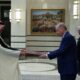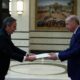 Cumhurbaşkanlığı Külliyesi'nde gerçekleştirilen kabulde İtalya Büyükelçisi Giuseppe Manzo, Cumhurbaşkanı Recep Tayyip Erdoğan'a güven mektubunu takdim etti. Fotoğraf: Ankara, (DHA)