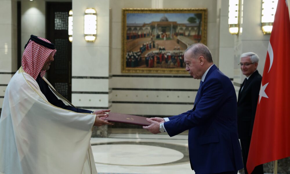 Cumhurbaşkanlığı Külliyesi'nde gerçekleştirilen kabulde Katar Büyükelçisi Faisal Abdullah H. A. Al Hanzab, Cumhurbaşkanı Recep Tayyip Erdoğan'a güven mektubunu takdim etti. Fotoğraf: Ankara, (DHA)