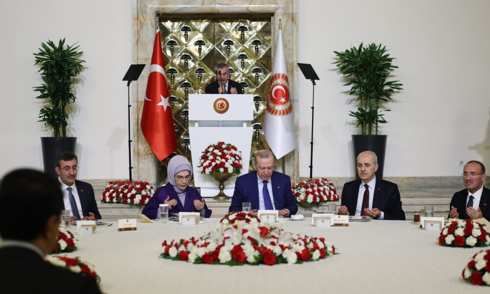 Cumhurbaşkanı Erdoğan, TBMMde Milletvekilleri ile İftar programına katıldı. Burada konuşan Erdoğan, “Milli Mücadelenin en sancılı günlerinde İstiklal Harbimizin Başkomutanı Gazi Mustafa Kemalin Yüce Meclisimizin kürsüsünden okuduğu, Ölmez bu vatan, farz-ı muhal, ölse de hatta, çekmez kürenin sırtı o tabut-u cesimi mısralarında vücut bulan ya istiklal ya ölüm inancını müstevlilere meydan okuyan yiğitlerin mukaddes davasını bir kez daha kemali hürmetle selamlıyorum. Bu vatan ölmez. Ölmesi farz-ı muhaldır. O farz-ı muhal gerçekleşse de dahi tüm dünya bu ağırlığın altında kalıp çökecektir. Bunun için Türkiye Türkiyeden büyüktür cümlesi sıradan bir söz, hamasi bir söylem asla değildir. Bu ifade Gazi Meclisimizin isminde de zikredildiği gibi kendi varlığının farkında olan bir milletin inancının, iradesinin, aşkının tespit ve tescilidir. Asil ve asıl olan milletin vekilleri olarak bugün o inancı sizler temsil ediyorsunuz. O aşkı sizler temsil ediyorsunuz. O iradeyi sizler temsil ediyorsunuz. Şahsım, ülkem ve milletim adına her birinize ayrı ayrı teşekkür ediyorum” diye konuştu.