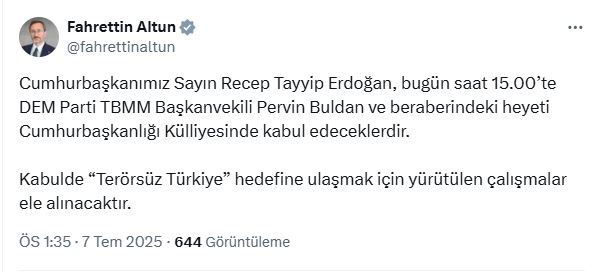 İletişim Başkanı Fahrettin Altun, sosyal medya hesabından yaptığı açıklamada, “Cumhurbaşkanımız Sayın Recep Tayyip Erdoğan, bugün saat 15.00te DEM Parti TBMM Başkan Vekili Pervin Buldan ve beraberindeki heyeti, Cumhurbaşkanlığı Külliyesinde kabul edeceklerdir. Kabulde, Terörsüz Türkiye hedefine ulaşmak için yürütülen çalışmalar ele alınacaktır” ifadelerini kullandı.