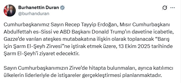 İletişim Başkanı Burhanettin Duran, sosyal medya hesabından yaptığı açıklamada, “Cumhurbaşkanımız Sayın Recep Tayyip Erdoğan, Mısır Cumhurbaşkanı Abdulfettah es-Sissi ve ABD Başkanı Donald Trump’ın davetine icabetle, Gazze’de varılan ateşkes mutabakatına ilişkin olarak toplanacak Barış için Şarm El-Şeyh Zirvesine iştirak etmek üzere, 13 Ekim 2025 tarihinde Şarm El-Şeyh’i ziyaret edecektir. Sayın Cumhurbaşkanımızın Zirve’de hitapta bulunmaları, ayrıca katılımcı ülkelerin liderleriyle de istişareler gerçekleştirmesi planlanmaktadır” dedi.