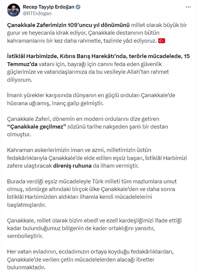 Cumhurbaşkanı Erdoğan: Her vatan evladının, Çanakkale’deki çetin mücadeleden alacağı ibretler vardır